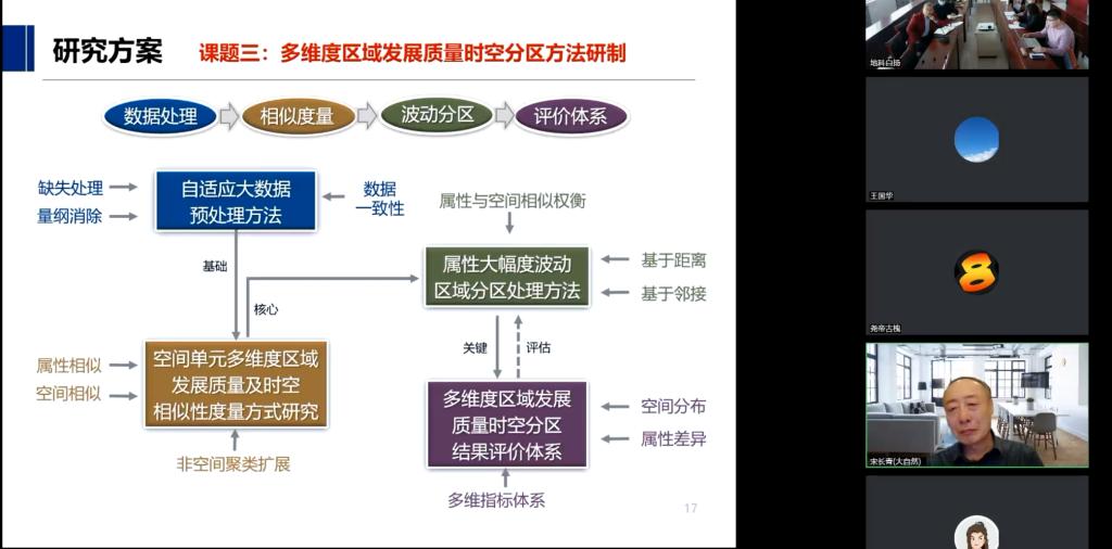 第二部分介绍研究目标和项目所关注的科学问题。宋教授从理论、方法和实践三个部分对研究目标进行了介绍,同时指出本项目所关注的两个研究问题,分别为:地理大数据的区域发展质量综合指数的确权方法和邻近区域大幅度空间数据波动条件下分区方法的构建。