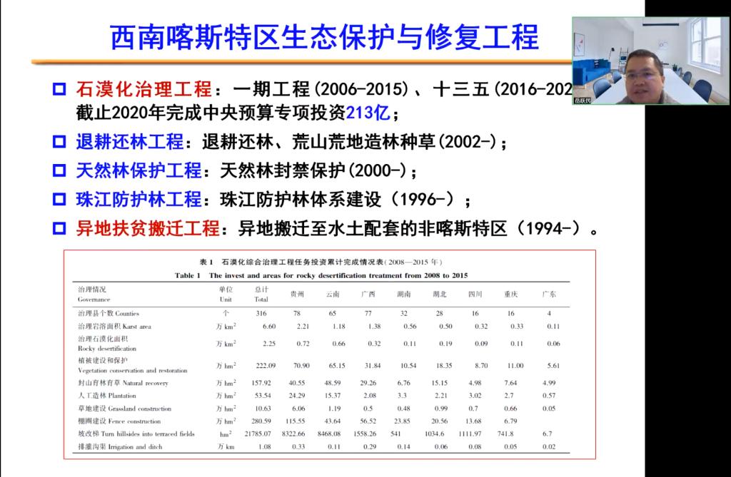 首先岳老师为我们介绍了本次研究的背景及意义。在全球变化和人类扰动导致喀斯特区域退化的大背景下,我国岩溶干旱、石漠化、水污染等生态环境问题频繁突出,为此应急需开展西南喀斯特区生态保护与修复工程,让喀斯特区域引领全球变绿,发挥生态固碳的潜力。