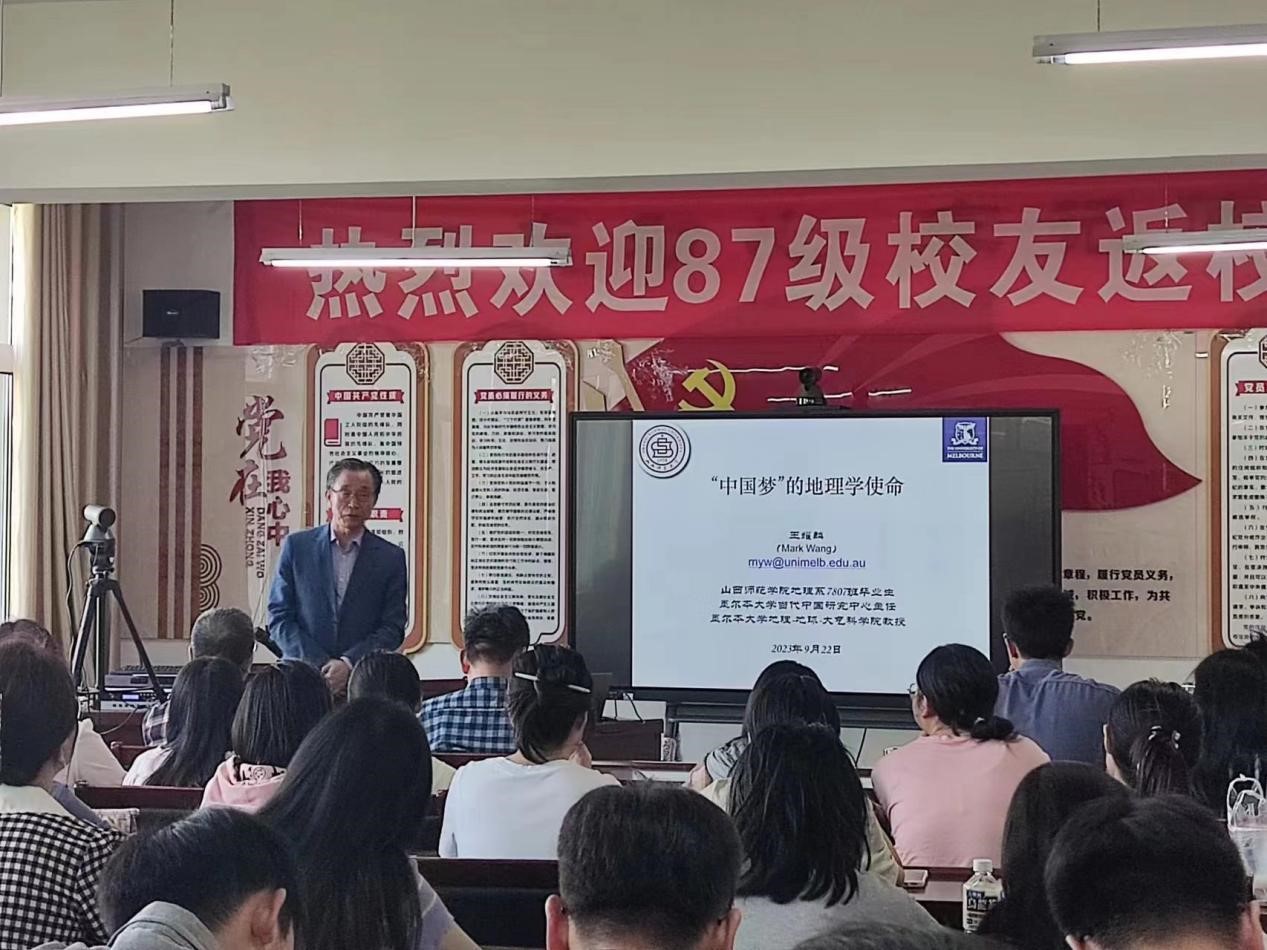 2023年9月22日上午9:30-11:30,必赢766net手机版邀请墨尔本大学的王耀麟教授,作了题为《中国梦的地理学使命》的学术经验分享会。本次报告由山西师范必赢766net手机版院长张仲伍主持,参会人员由康雷等多位老师以及23级全体研究生组成。