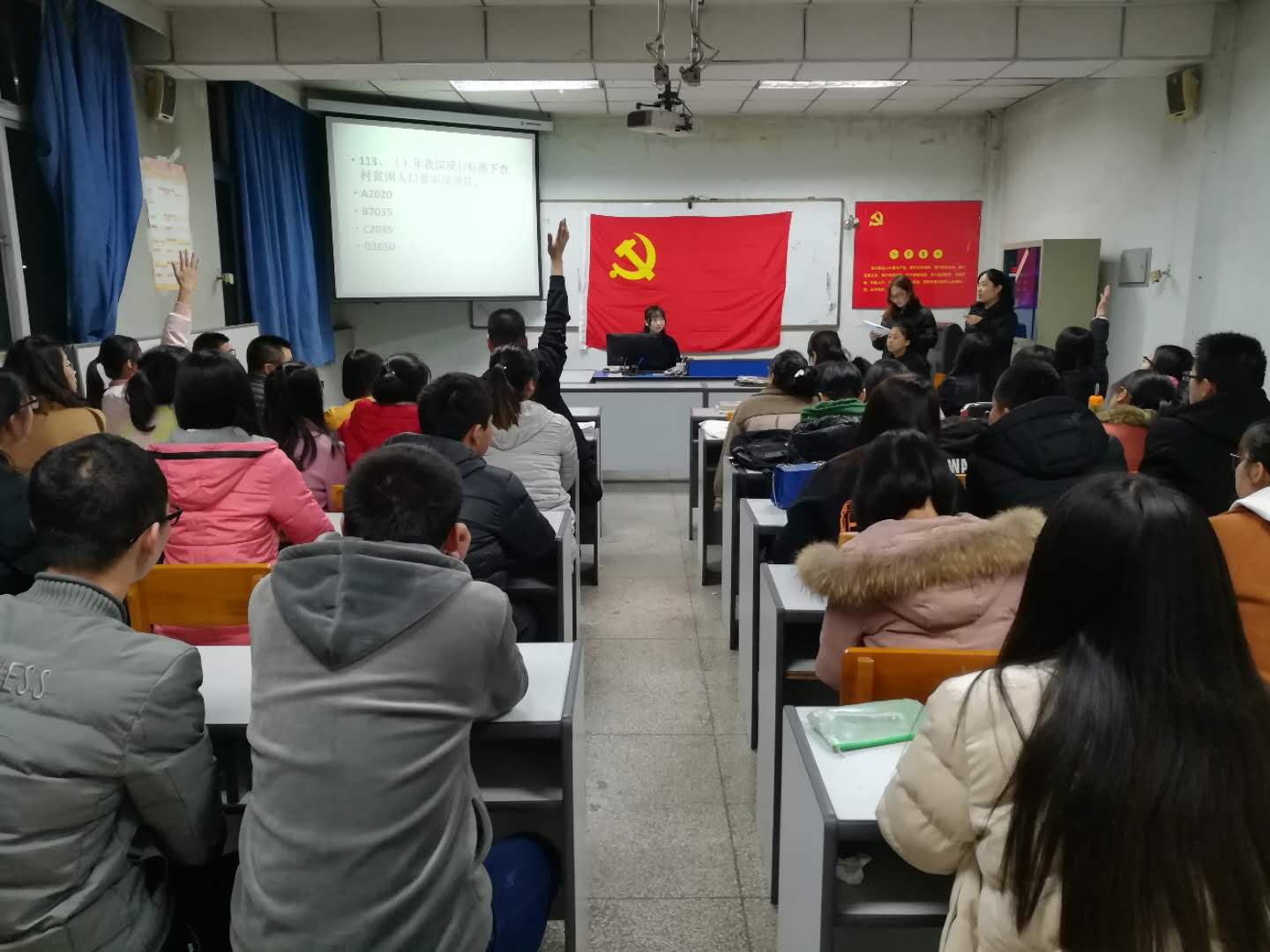 本次主题党日活动以学习宣传十九大精神为主题,以同年级不同班级为队伍,采取知识竞答、比拼的形式展开。竞赛分为必答题、抢答题和风险题三个环节,围绕党的十九大精选出150道题作为主要内容,涵盖了习近平总书记在中共十九大上所做的政治报告、新修订的《中国共产党章程》、中纪委报告等。知识竞赛现场气氛热烈、同学们答题踊跃,最后,17级自然地理专业团队以微弱优势战胜人文地理专业团队,成为了本次竞赛的优胜者。