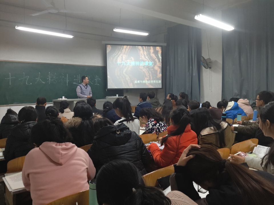 近日,遥感与地信应用党支部在2号楼310教室举办了十九大进课堂的主题党日活动,党员教师李小兵利用专业授课的机会,将十九大的精神穿插到了课堂教学之中。