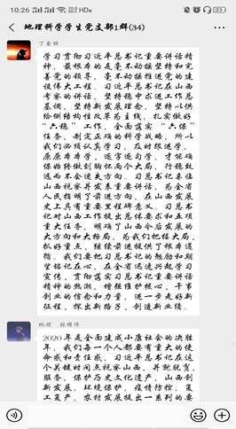 5月25日晚上八点,地理科学学生党支部在微信群里召开了学习习近平总书记视察山西重要讲话精神的线上会议,全体党员参加了此次会议,党支部书记程玲香主持会议。