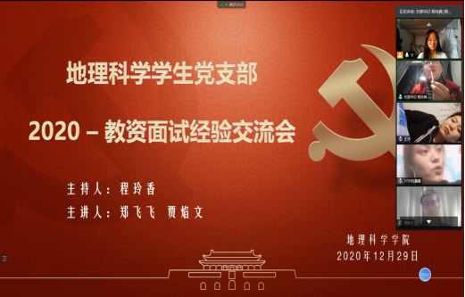 2020年12月29日晚,地理科学学生党支部在腾讯会议开了教资面试经验交流会。此次会议的在于让即将参加教资面试考核的同志们对教资面试有更加全面细致的了解。主讲人为支部书记程玲香同志、已获得教师资格证的郑飞飞同志和贾焰文同志,各班共107名有备考需求的同志参会。