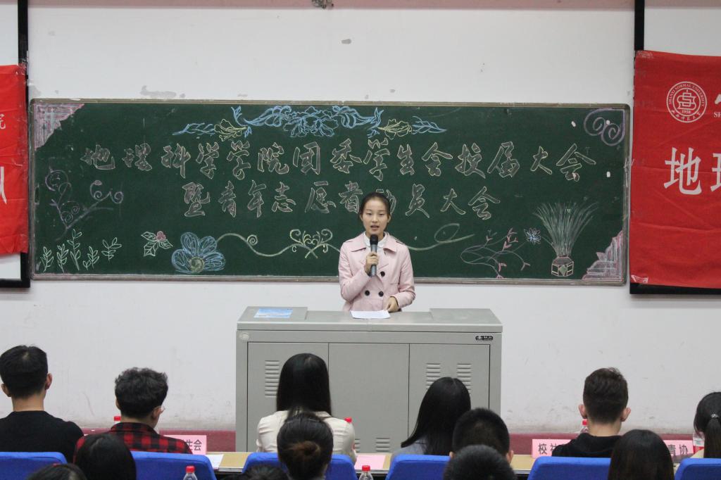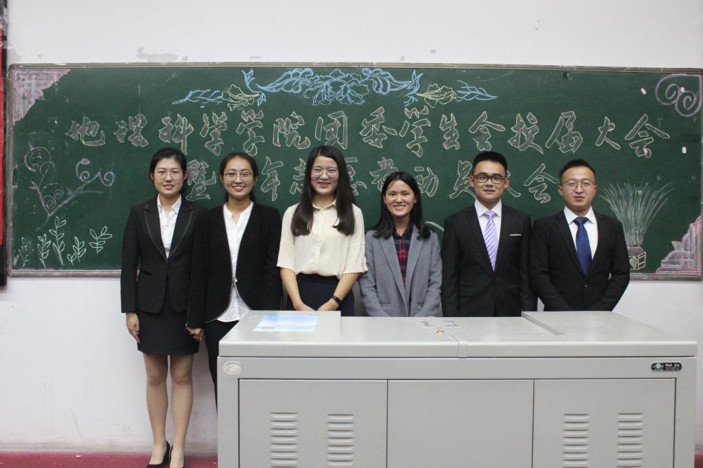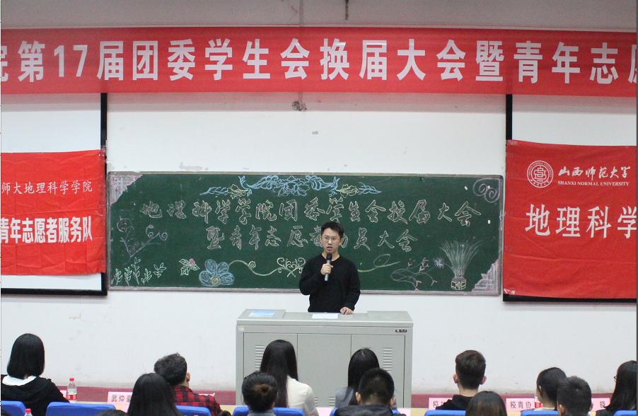 换届大会在全体与会人员激情豪迈的《中国共产主义青年团之歌》中拉开序幕。地理科学学学院第16届团委学生会主席武仲豪、校学生会主席团代表李嘉琛、文学院学生会主席赵连国先后发言,对学院上一年学生干部的工作成绩表示肯定,同时也对新一届学生会成员给予了殷切期望。王亚婷老师和郭丽婷老师为优秀干部颁发了荣誉证书,为新一届学生干部颁发了聘书。第17届团委学生会主席郭梦媛作表态发言,她希望全体学生会成员能够团结一心,积极进取,在创新佳绩。