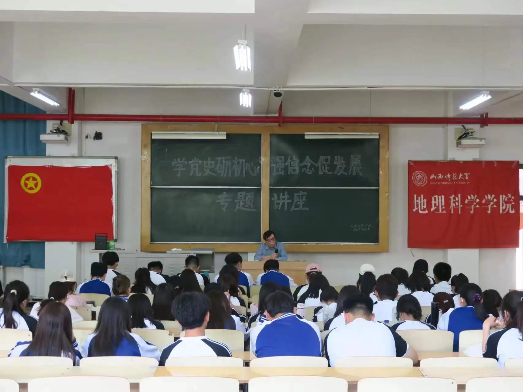 李振中老师以“深入学习党史,不忘初心使命”为主题,介绍了党史学习的内容、凝聚的精神及其发展阶段。李老师教育通过社会主义核心价值观引入主题,向大家讲述了中国共产党的历史发展进程,并表明中国共产党为中国人民谋幸福、为中华民族谋复兴的初心和使命是激励中国共产党人不断前进的根本动力。同时,李振中老师向我们提出要求,青年要勇于开拓创新,树立科学精神,积极进取,勤奋工作。讲座结束后,志愿者组织全体同学齐唱团歌,在歌声中进一步坚定理想信念。