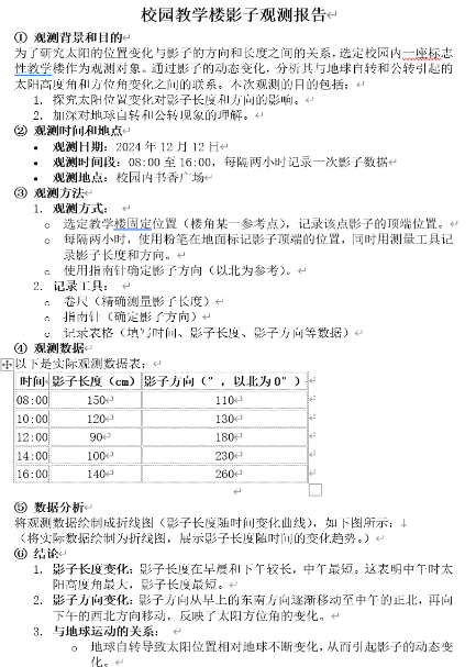 在活动过程中,同学们按照预定的时间和地点,认真观察了教学楼影子的变化,将每次测量得到的影子长度、方向、时间以及太阳方位角等信息记录在观测表格中,并及时对数据进行整理和检查,确保数据的真实性和可靠性。其间,同学们还尝试结合所学的地理知识,对这些现象进行了初步的解释和分析,展现出了强烈的求知欲和探索精神。