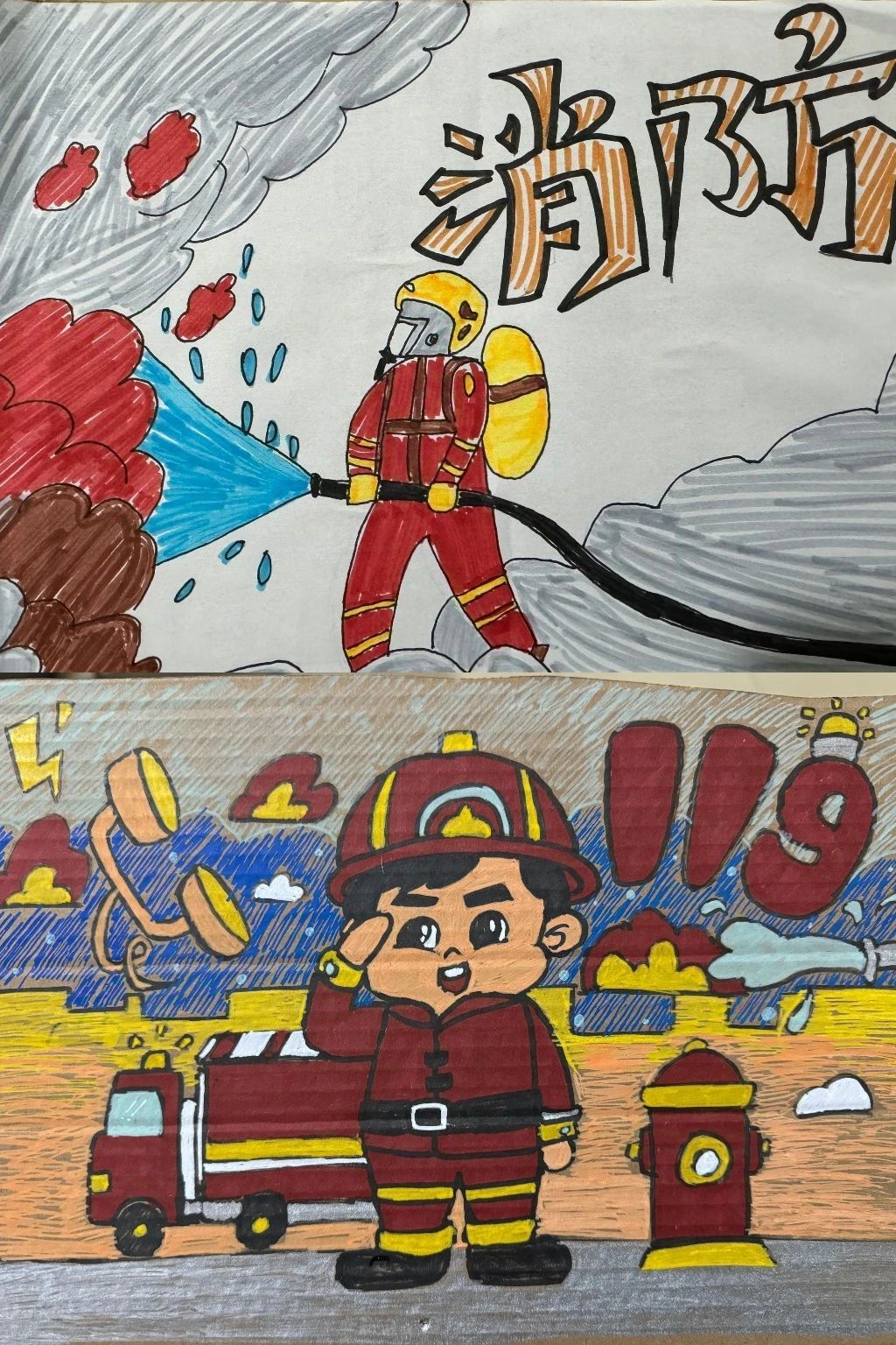 活动中,同学们利用纸袋、纸板等废旧材料,创作出精美的消防主题画作,不仅激发了同学们的创新思维,同时也深化了自身对消防知识的理解,实现了废物的再利用。
