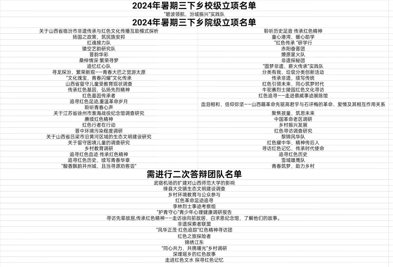 经过综合评选,最终共有 46个团队答辩通过,予以立项。本次暑期“三下乡”社会实践立项团队具体名单如下: