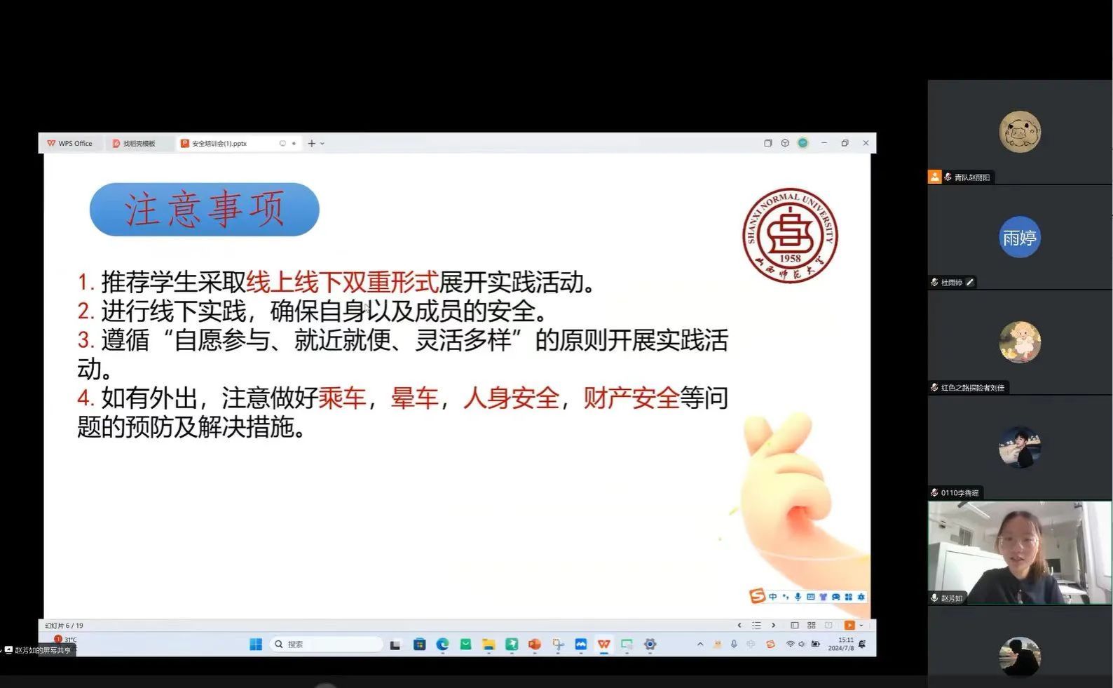 为积极推进2024年暑期“三下乡”社会实践活动的开展,强化学生的安全意识和纪律观念,确保社会实践活动的顺利完成,7月8日,我院于线上举行暑期“三下乡”社会实践活动安全培训会。