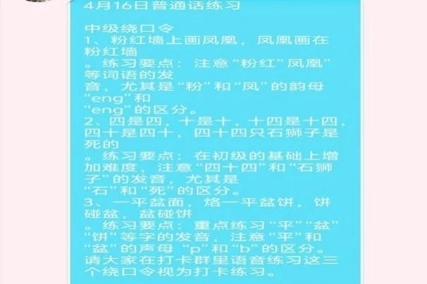 为营造良好的语言学习氛围,切实提升学生普通话应用能力,4月14日普通话艺术团推出“语润芳华,声动未来”普通话练习线上打卡活动。旨在通过线上打卡的形式,帮助同学们增强语言表达能力,为未来的学习和职业发展打下坚实基础。