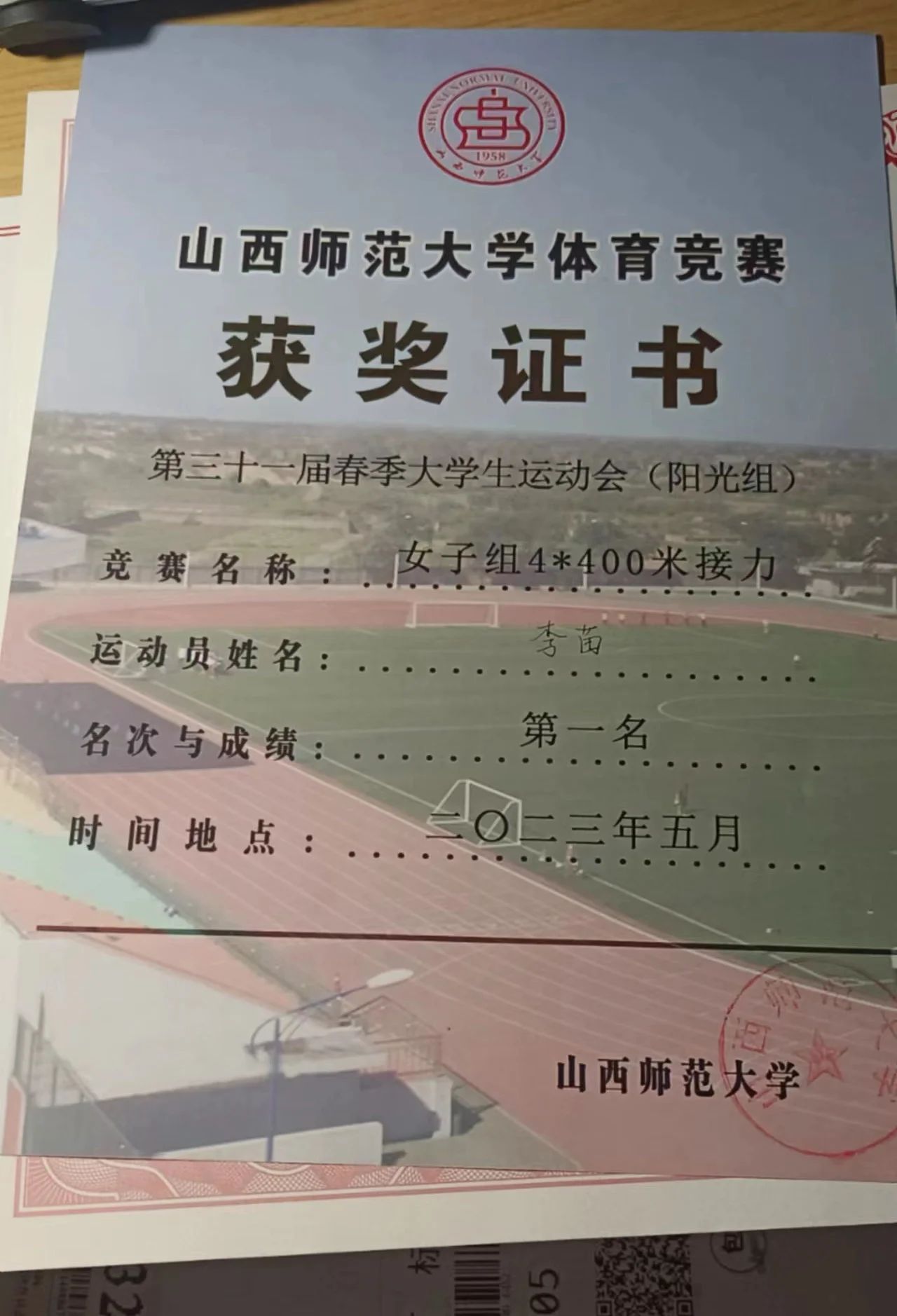 山西师范大学第三十一届春季大学生运动会女子组4*400米接力第一名。