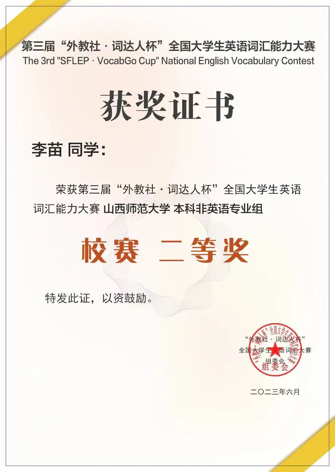 第三届“外教社·词达人杯”全国大学生英语词汇能力大赛山西师范大学本科非英语专业组校赛二等奖;