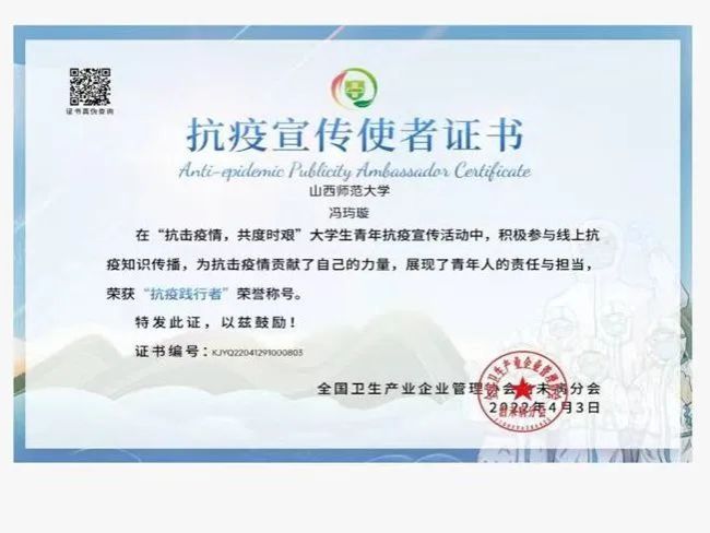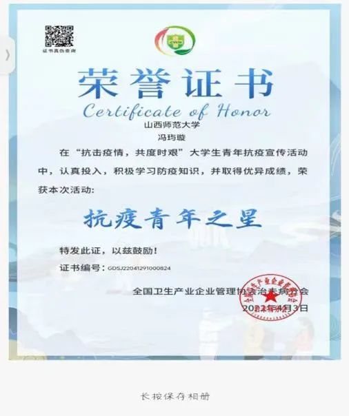 “抗疫青年之星”称号电子证书和“抗疫践行者”称号;
