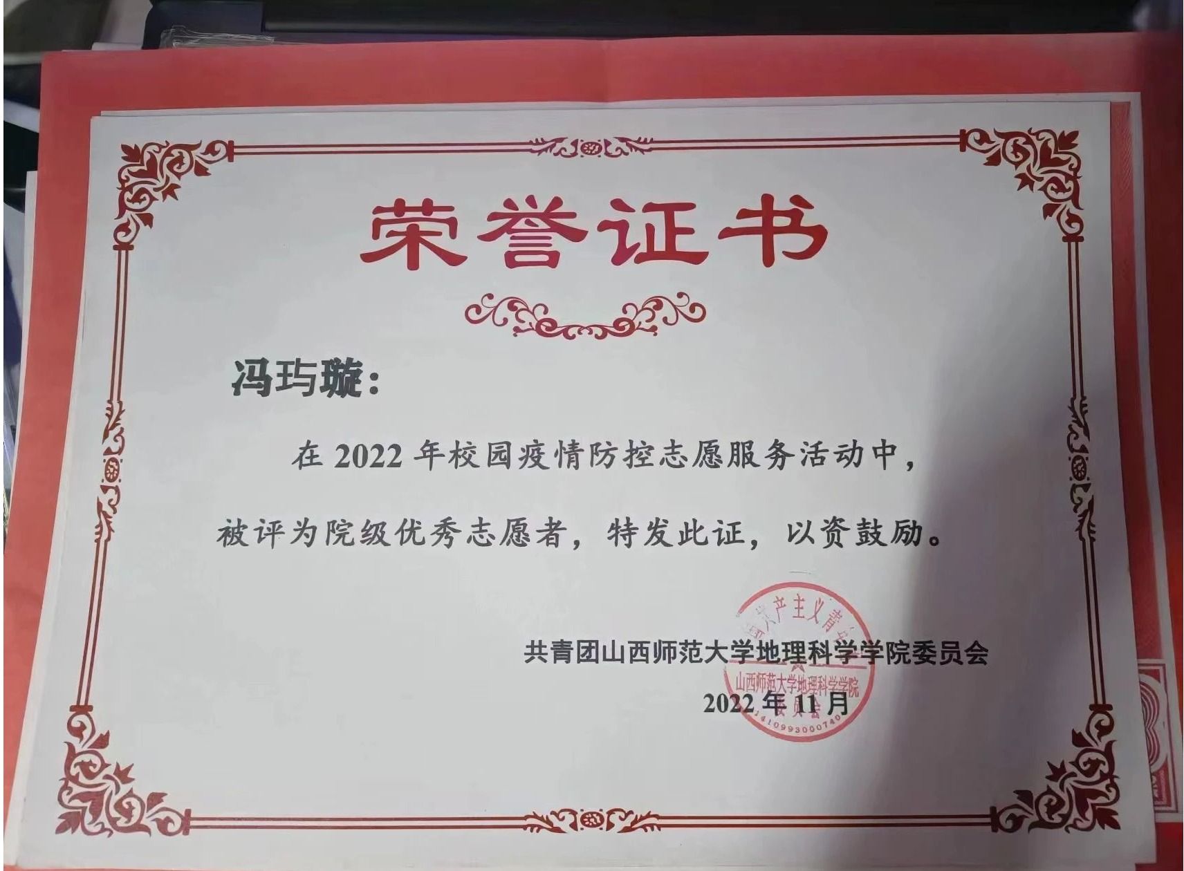 在校园疫情防控中,获得院级优秀志愿者;