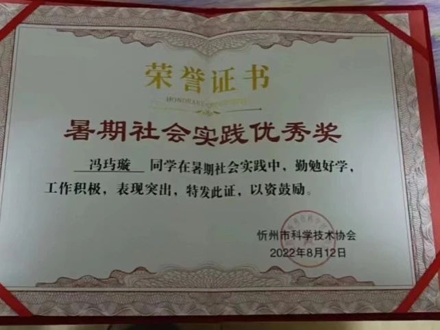 “返家乡”社会实践活动“暑期社会实践优秀奖”;