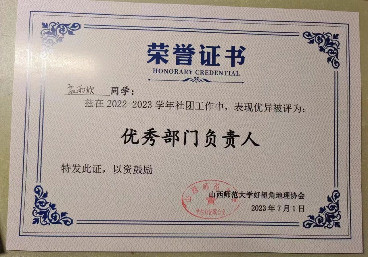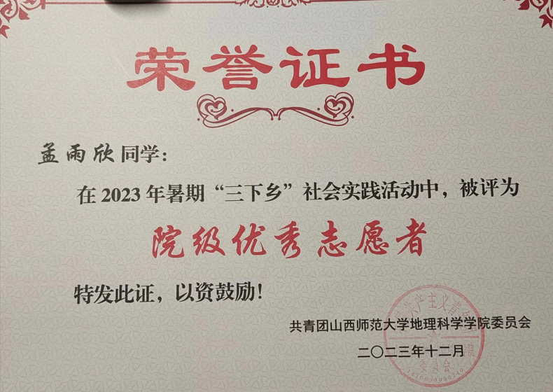 大一学年,她为山西师范大学图书馆学生管理委员会宣传部、院学生会文艺部部员,积极组织参加各项活动,多次荣获“优秀部员”“优秀志愿者”等荣誉;大二学年,她担任好望角地理协会外联宣传部负责人,认真负责的完成各项任务,获“优秀社员”“优秀部门负责人”荣誉。在假期、学校,她积极参加感谢恩师、三下乡、青春兴晋以及挑战杯、创青春等志愿服务和创新创业活动,获“院级优秀志愿者”称号,还连续两年积极进行无偿献血。