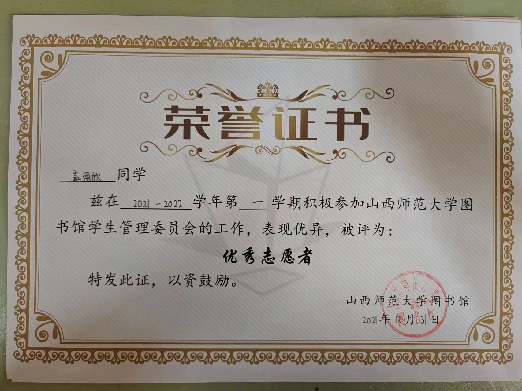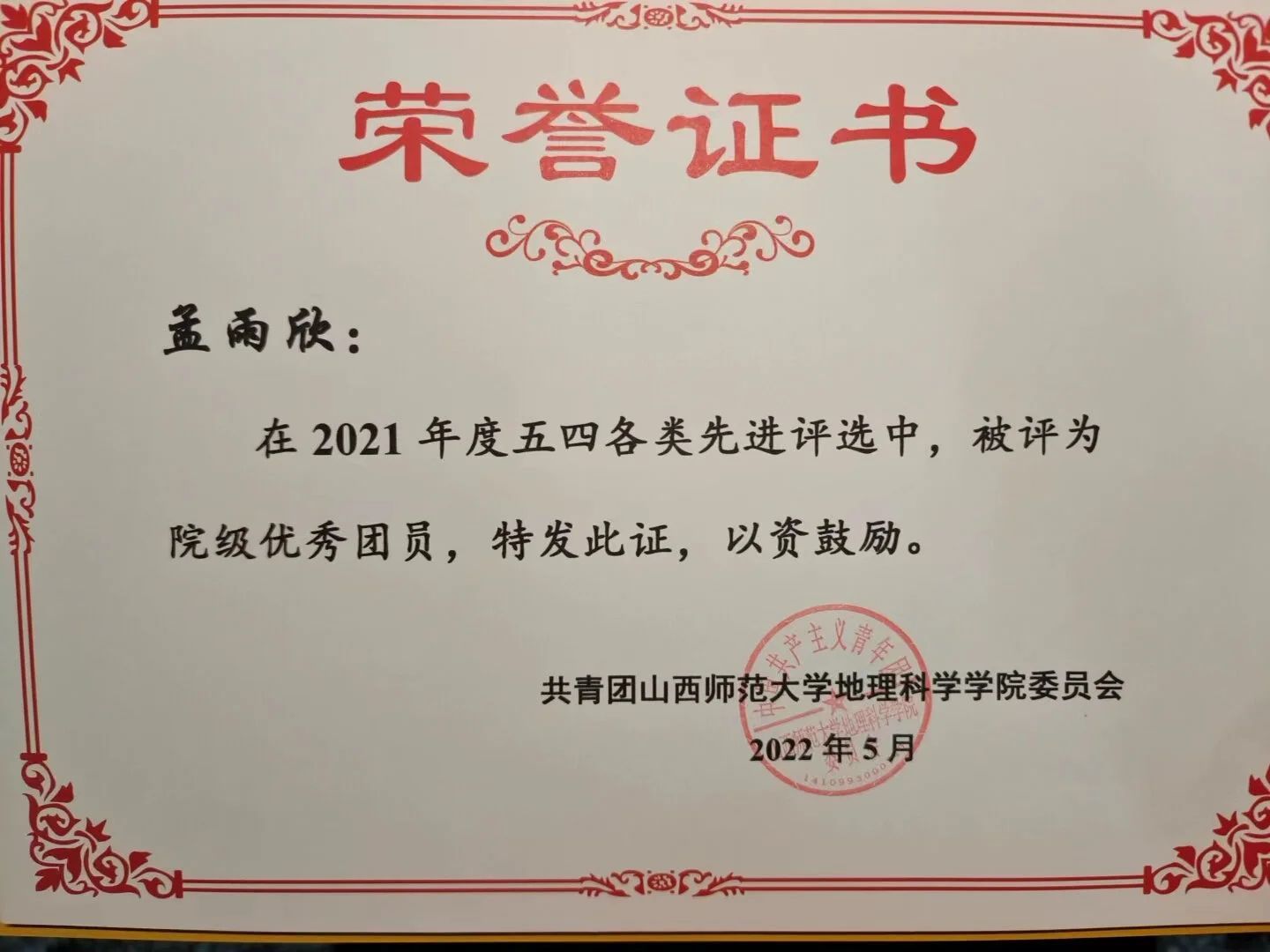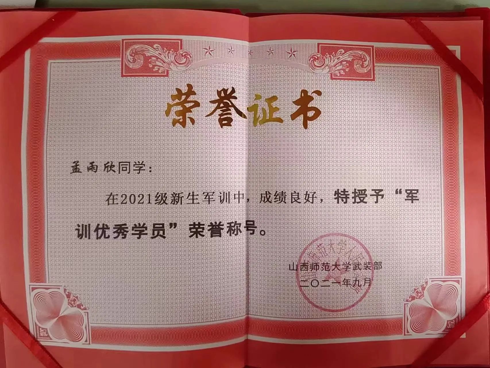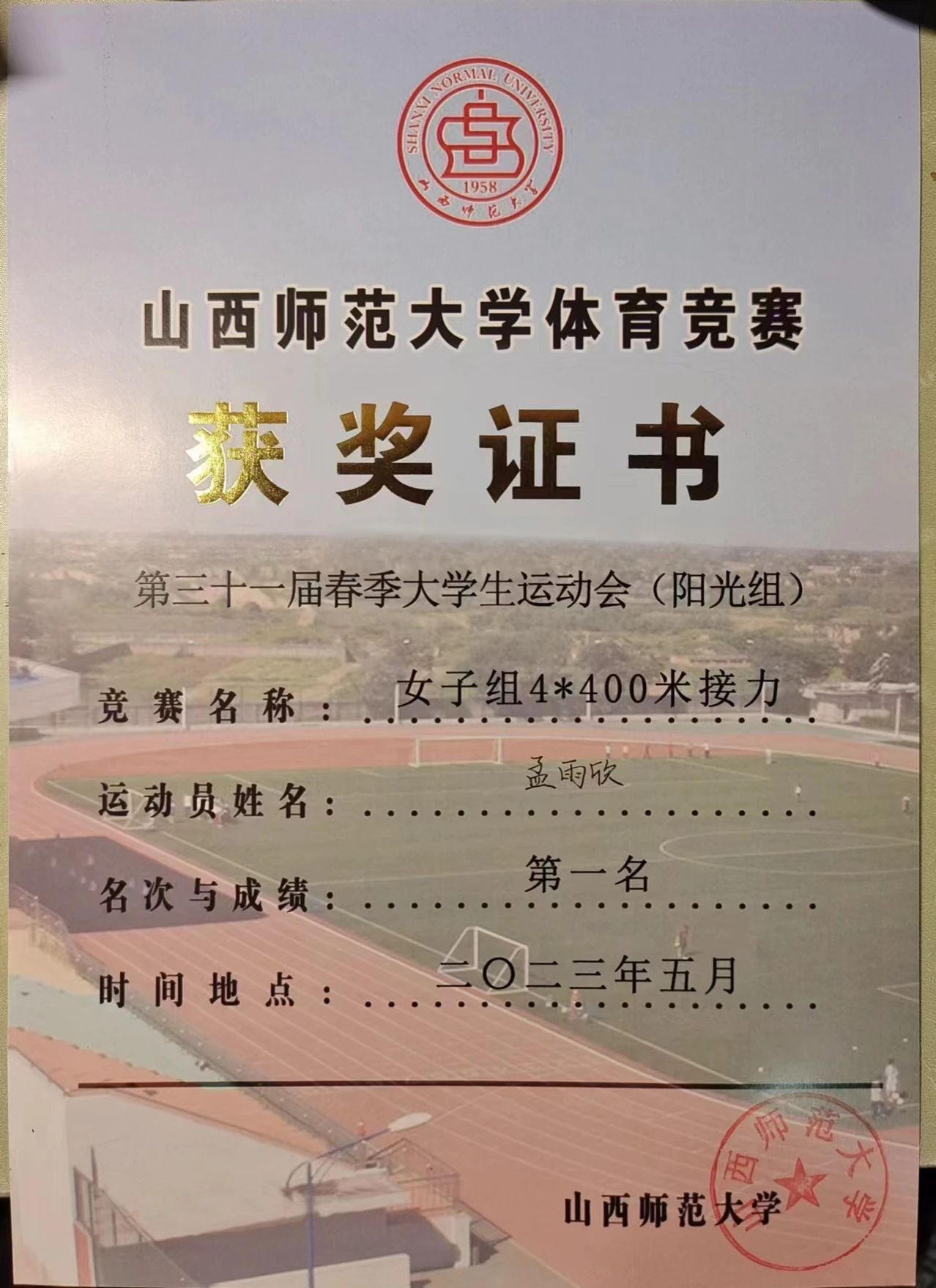 此外,在体育运动方面,她积极参加运动会等大型校级比赛,参加项目分别获第一、二名,为学院体育方面的荣誉做出了部分贡献,还曾荣获“军训优秀学员”“2021年度院级优秀团员”等荣誉。