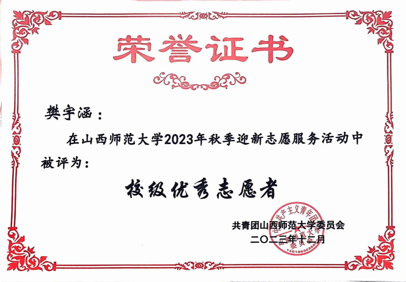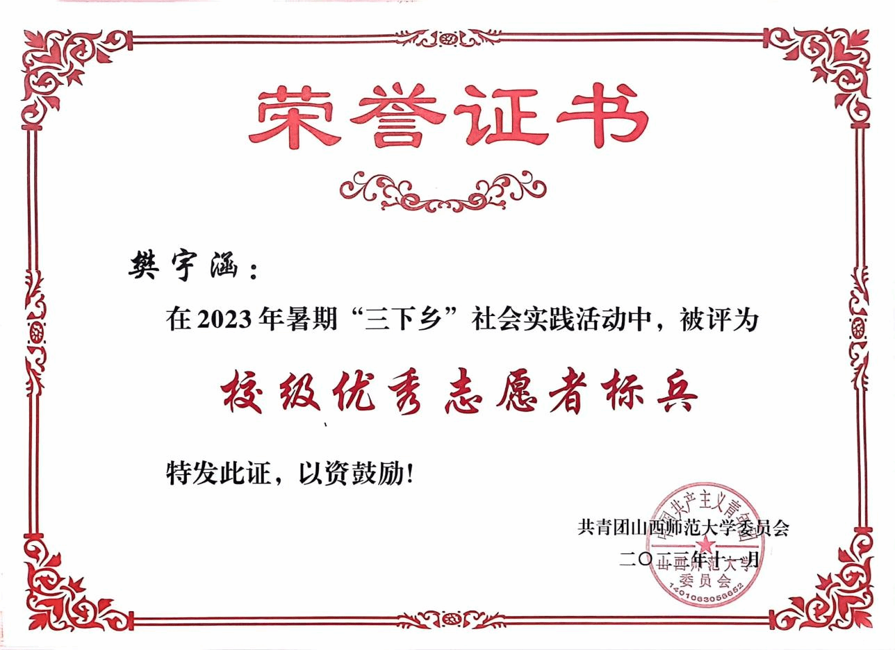 2023年11月,获暑期三下乡校级优秀志愿者标兵;