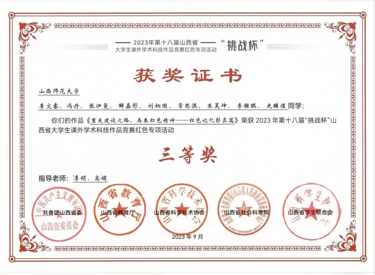 2023年第十八届“挑战杯”山西省大学生课外学术科技作品竞赛 省级三等奖;