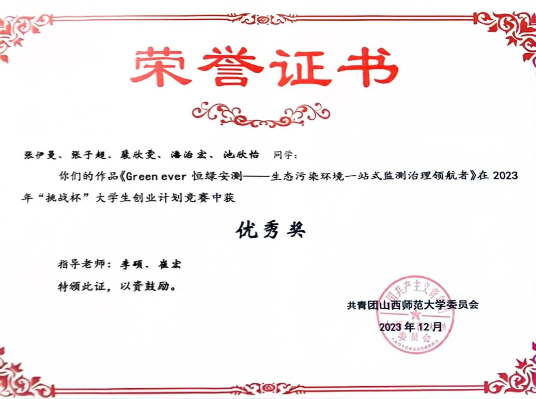 2023年山西师范大学“挑战杯“大学生创业计划竞赛 校级优秀奖;