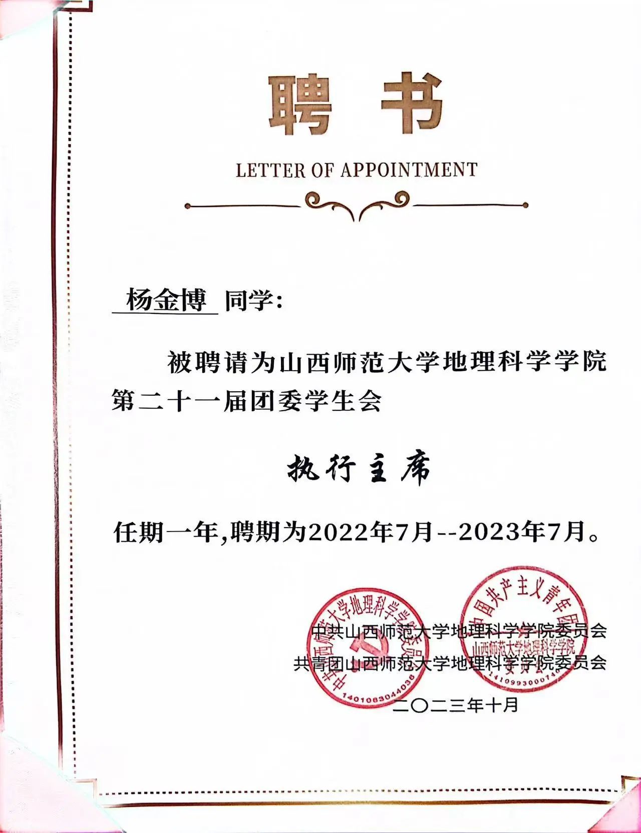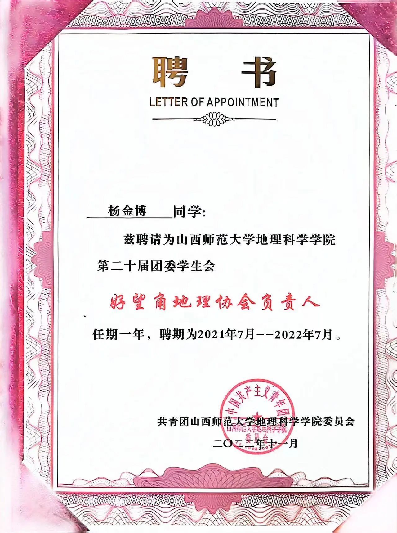 山西师范大学好望角地理协会第十一届社长、