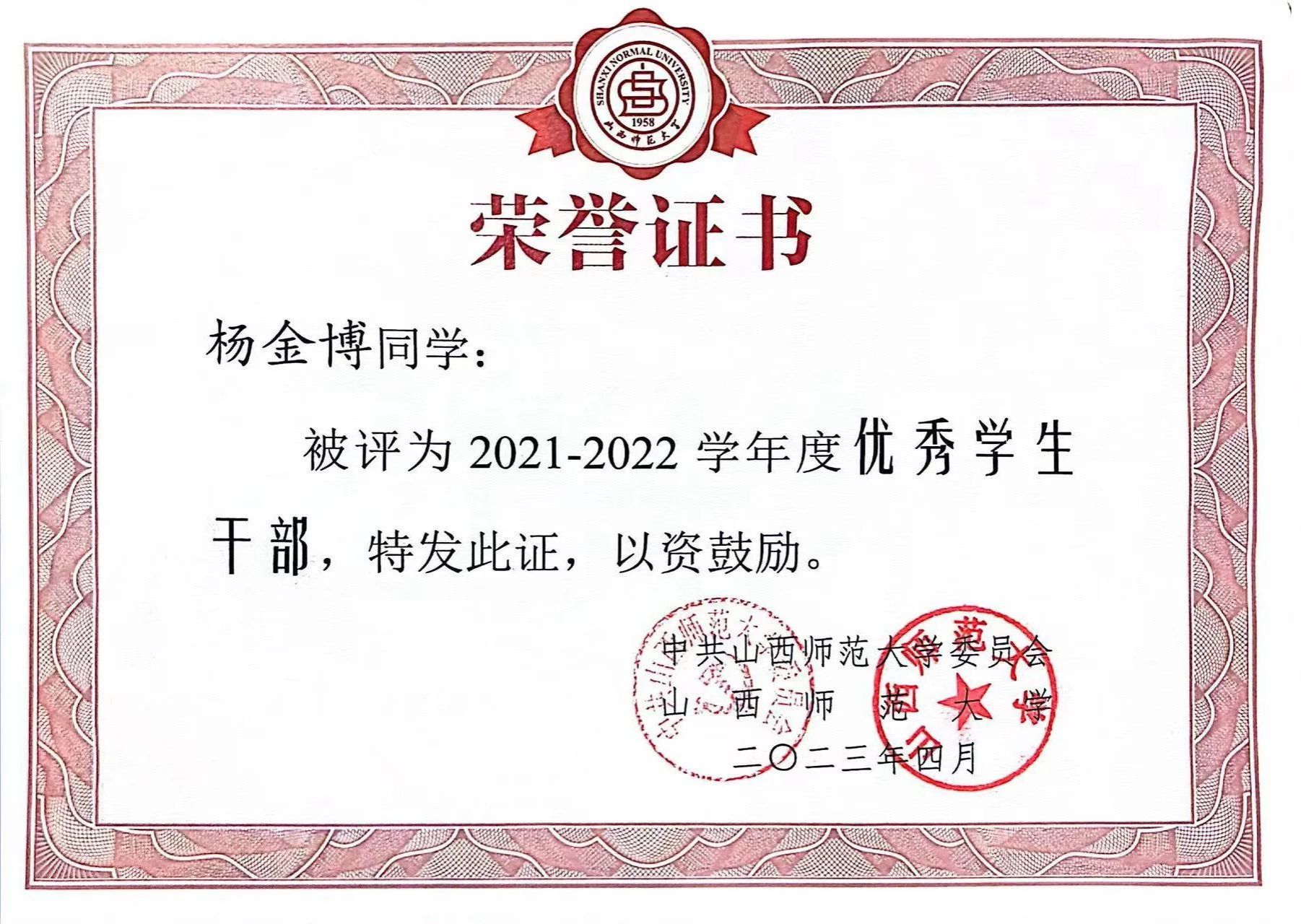 2023年12月,国家励志奖学金、山西师范大学学年一等奖学金;