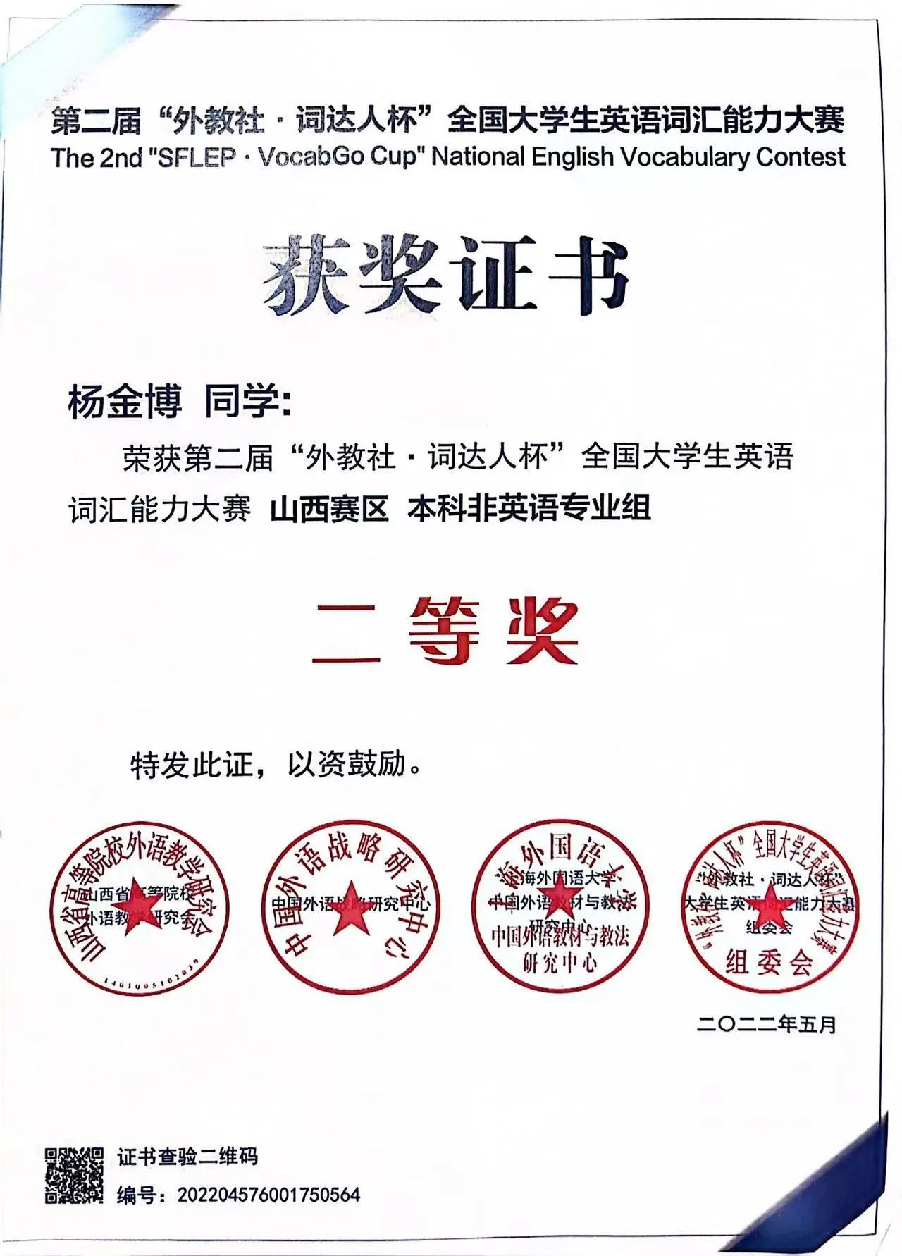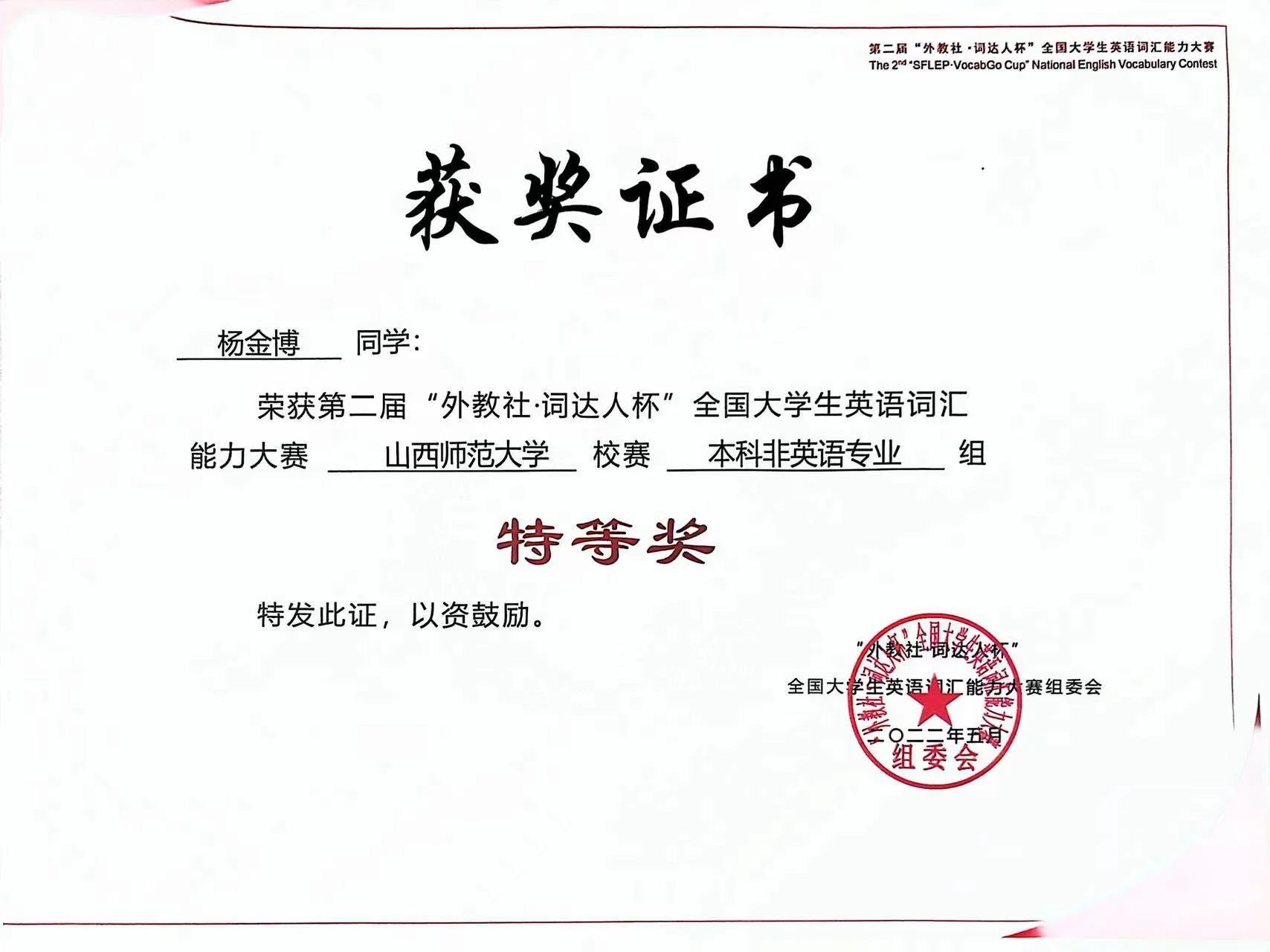 2022年05月,“外教社词达人杯”英语竞赛省级二等奖,校级特等奖;
