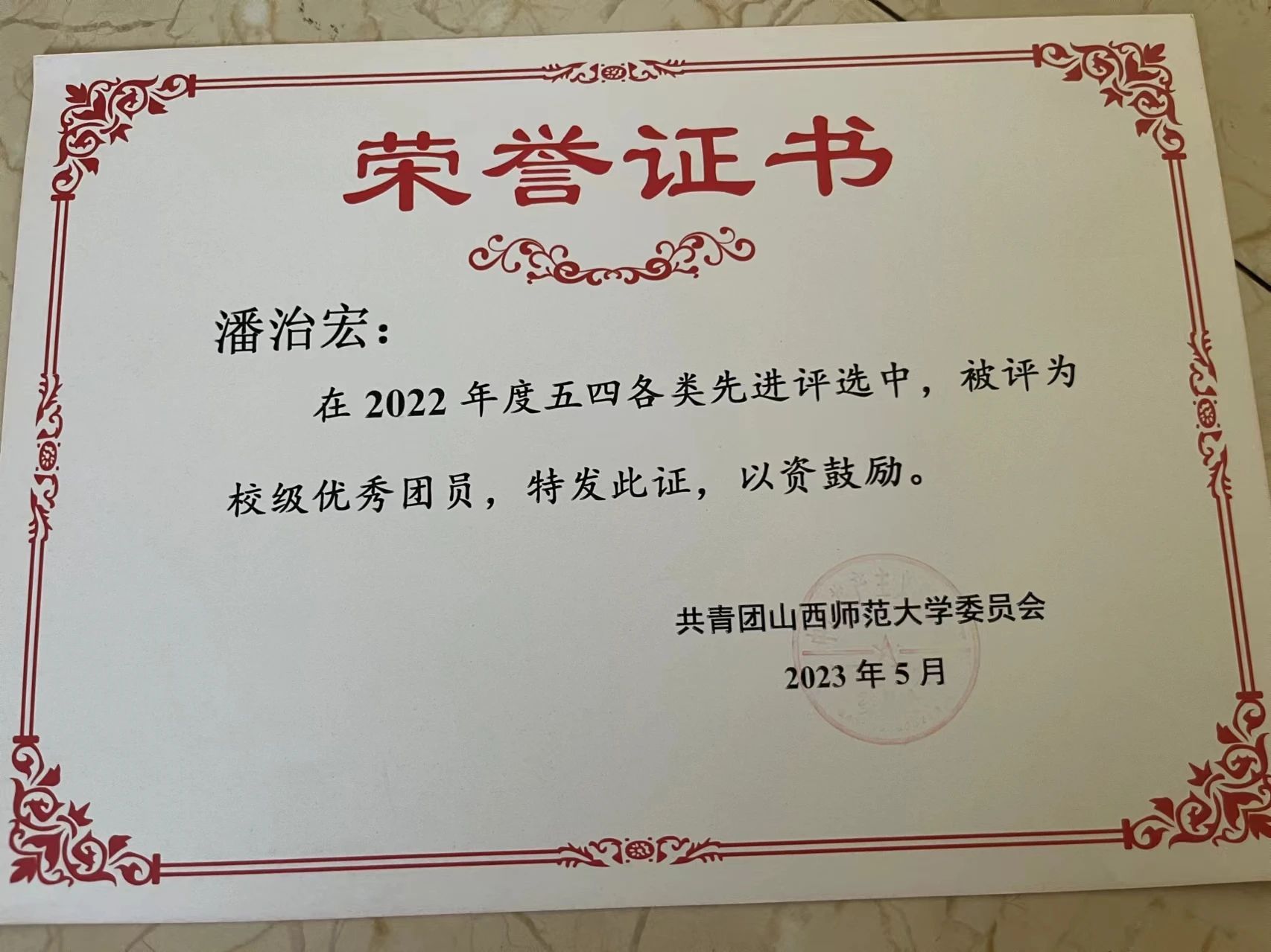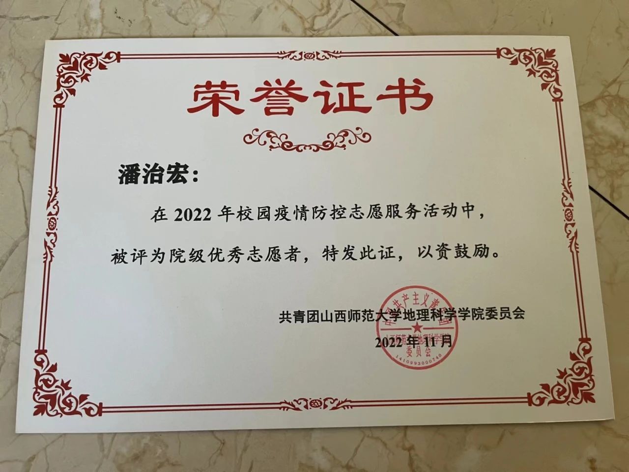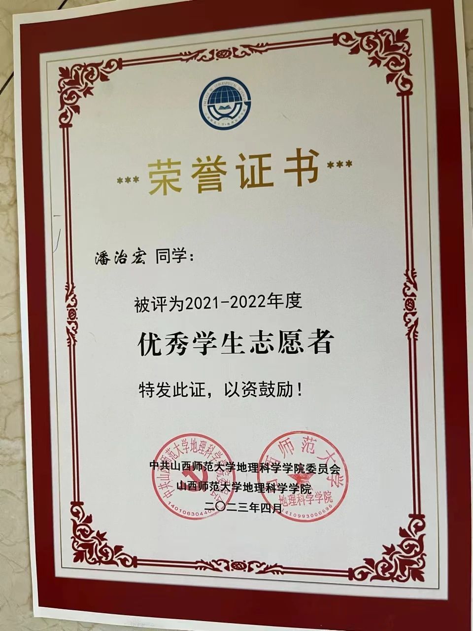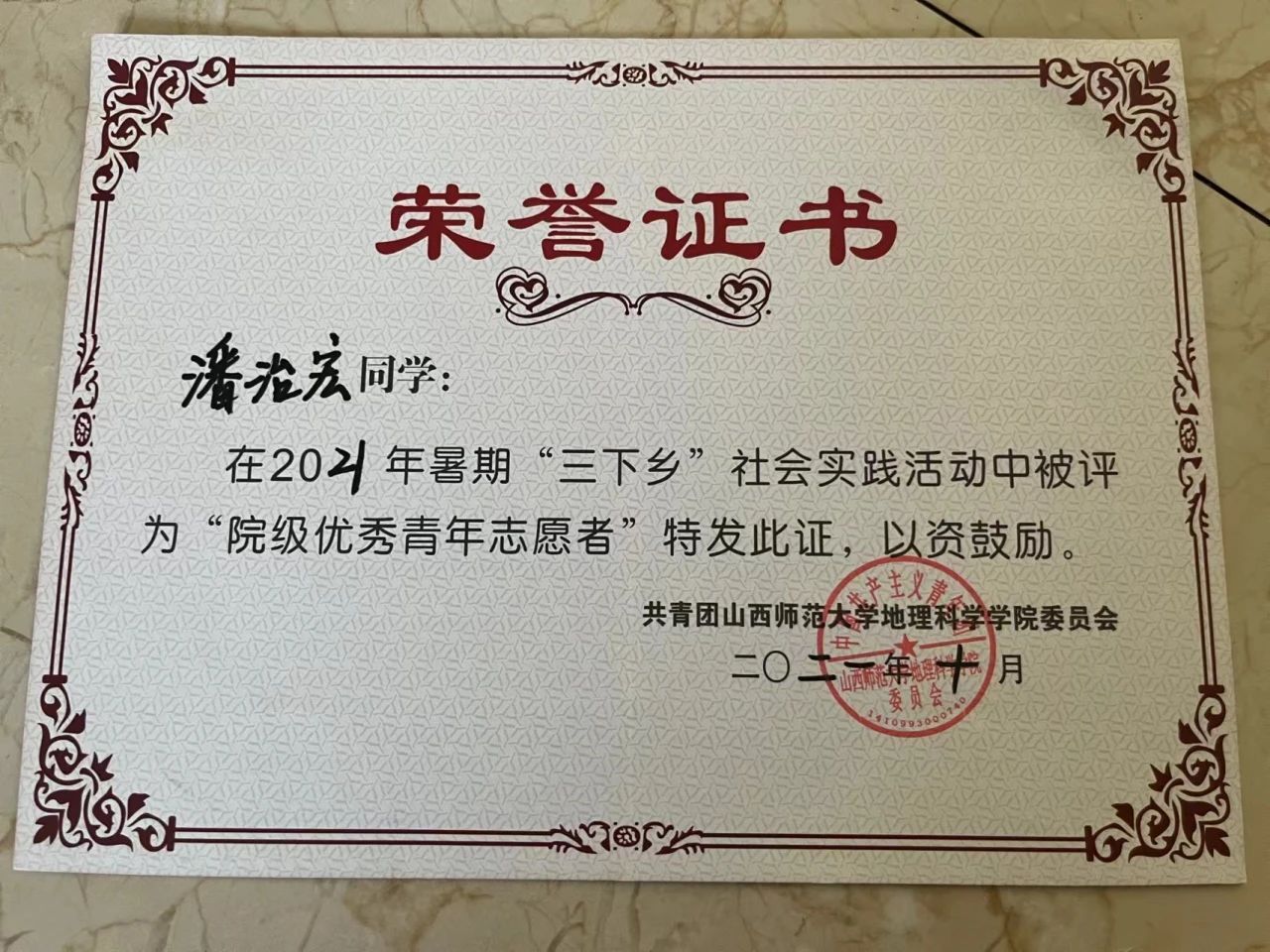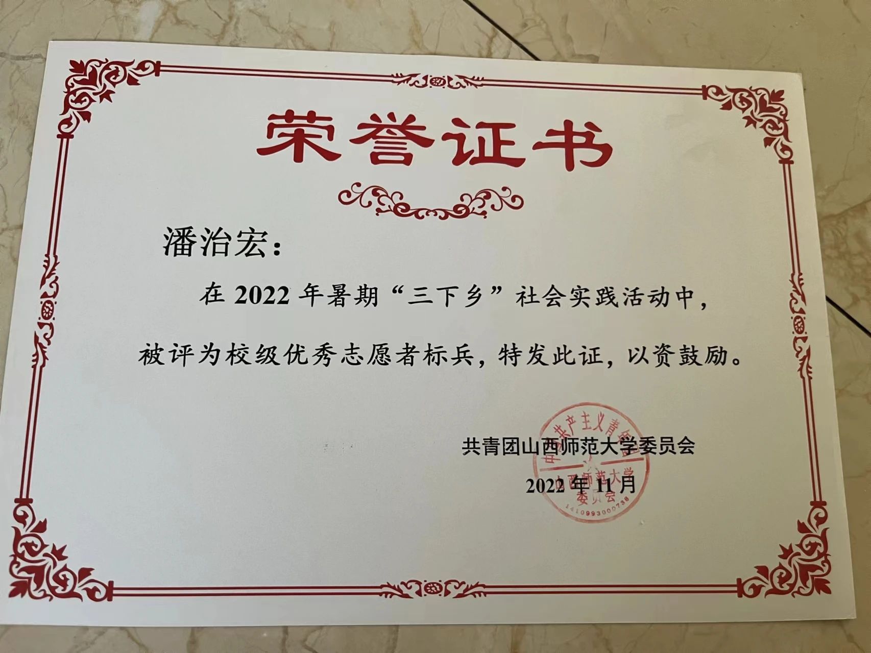 2022年11月获“三下乡”校级优秀志愿者标兵;