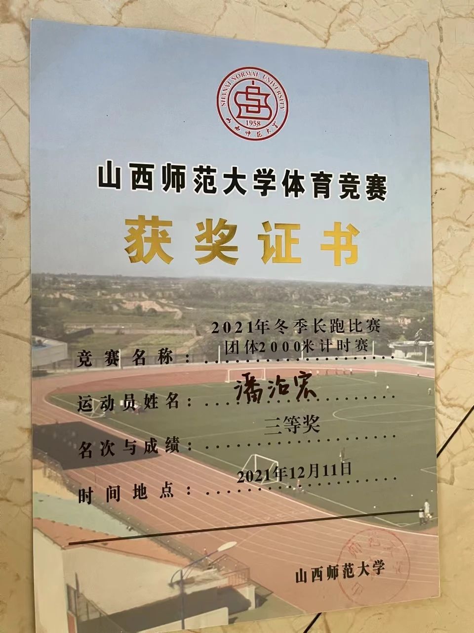 2021年12月获冬季长跑团体两千米计时赛校级三等奖;
