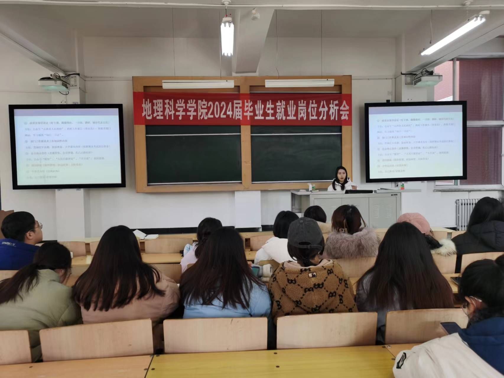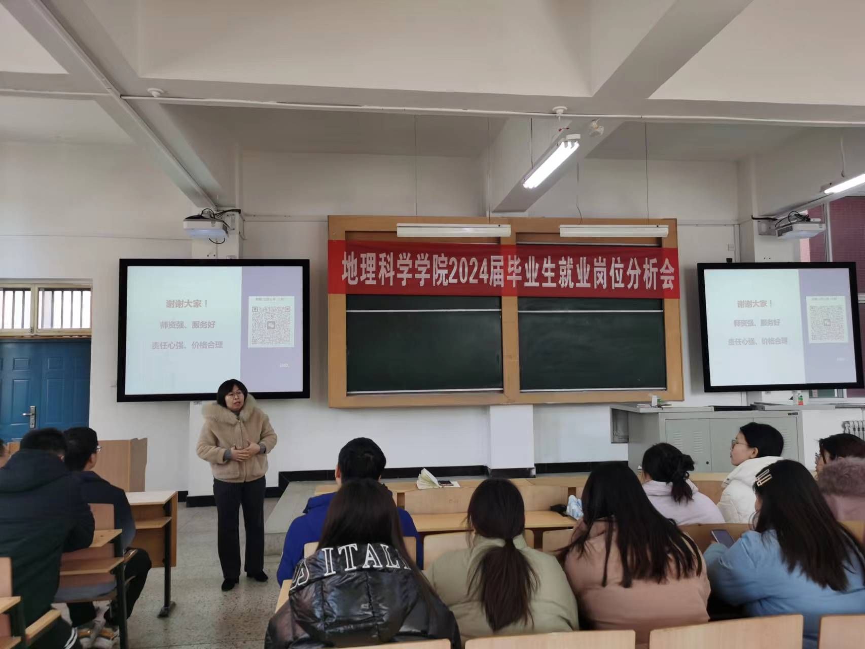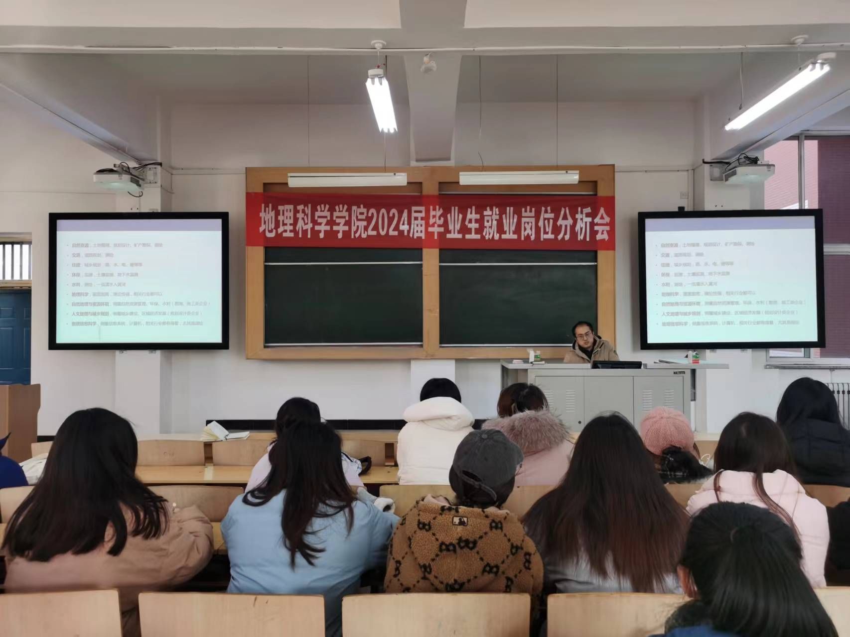 会议邀请某机构知名讲师为学生做了讲解,两位老师从国企、私企、学校、政府机关等多个方面详细讲解地理学专业就业岗位的特点和面试技巧,分析各方优劣,理性判断形势,同时鼓励同学们要不负青春,艰苦奋斗,多尝试,多体验,不断磨砺自己,争取拿到自己理想的岗位。