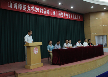 在庄严的《义勇军进行曲》结束后,副院长王贵文副教授首先宣读了2013届毕业及授予学位学生名单。院党委副书记康永和同志宣读了2013年竞赛优胜奖、优秀毕业生论文名单。随后,出席会议的领导为毕业生颁发了毕业证书和荣誉证书。省级优秀毕业生0902班张玉枝同学作为学生代表在会议上进行了情深意切的发言,既表达了对母校对恩师的留恋与不舍,也表示了为实现中华民族伟大复兴的中国梦做出自己的贡献,让青春在时代进步中焕发出更加绚丽光彩的决心!地理信息科学系系主任李明博士代表全体教师发言,他指出学院为学生的成长进步而感到由衷的喜悦和自豪,无论将来学生走到哪里,都会带着老师的祝福与牵挂,希望同学们能常回母校回学院走走看看。最后院长、硕士生导师张永清教授做了重要讲话。