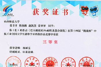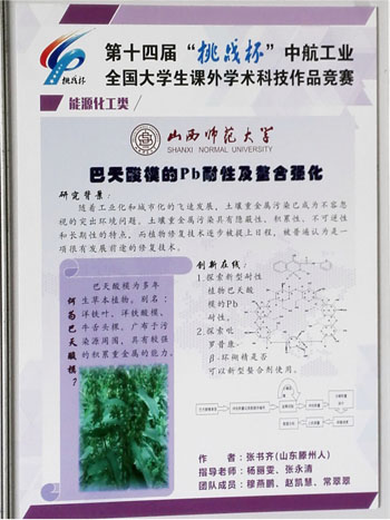 11月16日到22日,第十四届“挑战杯”中航工业全国大学生课外学术科技作品竞赛终审决赛在广东工业大学隆重举行。由我省选送的我院地理信息系统专业11级学生张书齐同学的作品《巴天酸模的Pb耐性及整合强化》进入终极评审并荣获三等奖。