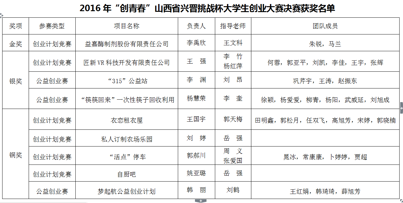 6月2日至5日, 2016年“创青春”山西省兴晋挑战杯大学生创业大赛决赛终审答辩在山西工商学院隆重举行。我校入围决赛终审答辩的9个创新创业团队在陈述和答辩过程中表现优异,发挥出色,最终获得金奖1项、银奖3项、铜奖5项,我院研究生郭郝川等同学的《“活点”停车》获得创业计划类铜奖。