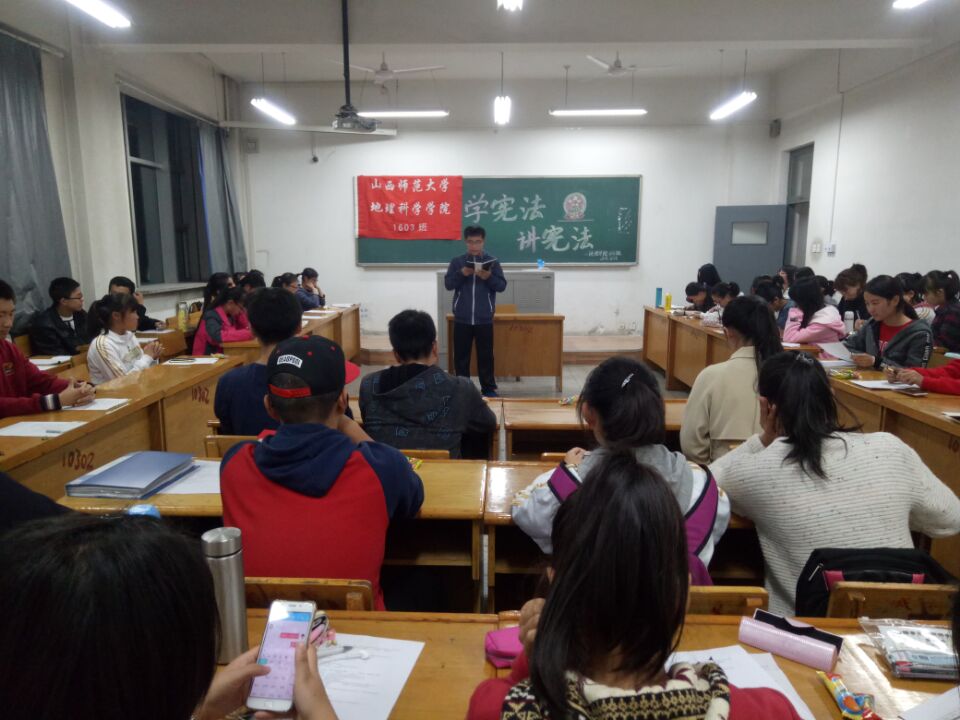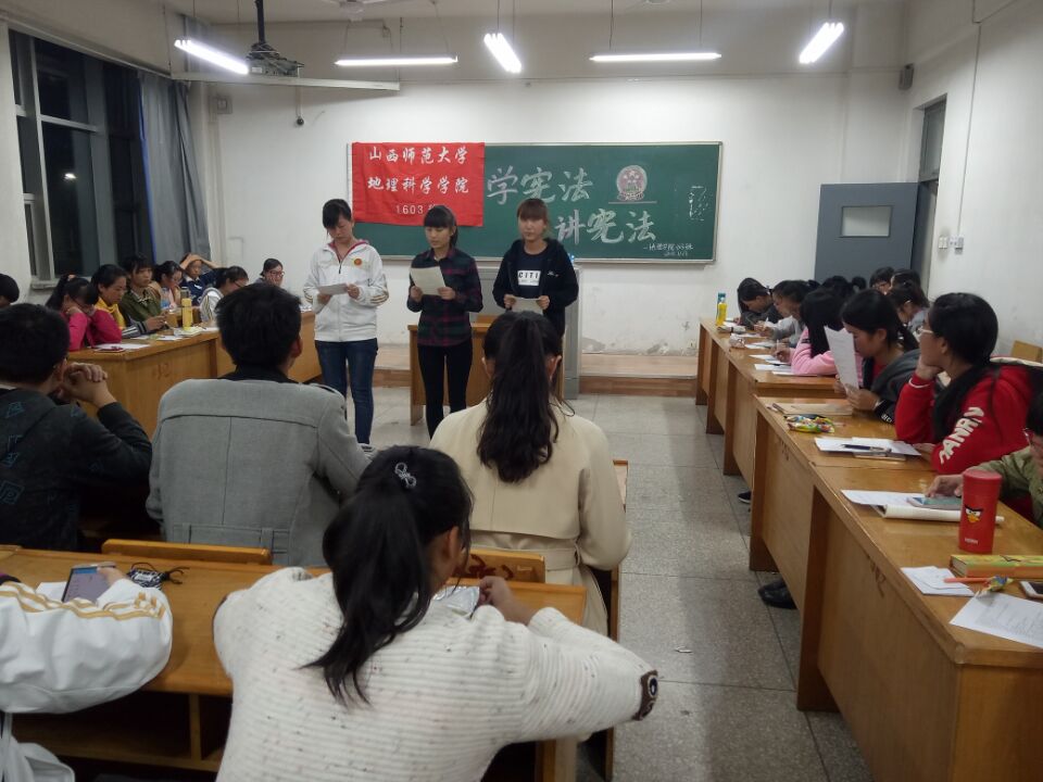 为了深化2016年“国家宪法日”的学习宣传教育,积极响应我校依法治校的号召,提高同学们的法律意识。地理学院1603班于11月3日在10302教室开展了“学宪法讲宪法”的主题班会。