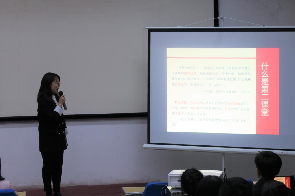 活动第三部分,学生团委副书记宋健琪向大家进行了“第二课堂成绩单”制度培训,详细讲解了我校第二课堂制度实施的要求、学分认定细则和到梦空间APP的使用方法,进一步强调了第二课堂成绩的重要性。同学们纷纷表示要积极参加各类第二课堂活动,努力丰富自己的课余生活,积极提升个人综合素质。