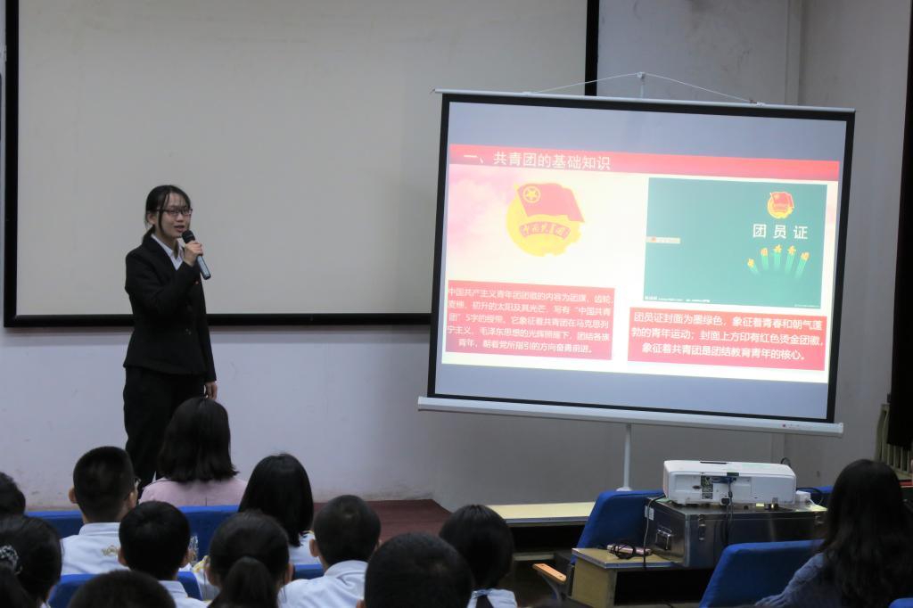活动在《光荣啊!中国共青团》的歌声中拉开了帷幕。活动第一部分中,学生团委副书记王婧瑶带领大家共同学习了共青团基本知识,包括团的历史和性质、团的基本任务和奋斗目标、团员的权利和义务以及团旗、团歌、团徽、团员证的相关知识和内容。随后,2003团支部书记白茜带领大家重温了入团誓词,团委学生干部为新生团员代表授团旗,王亚婷、谢碟妮、王钊三位老师为新生团员代表佩戴团徽,并鼓励大家不忘入团初心,练就过硬本领,努力担当新时代赋予的责任。2006团支部书记张昕如同学代表新生团员发言,她号召新生团员们不仅要努力奋斗,勇于奉献,敢于担当,还要向疫情防控期间涌现出的英雄人物学习并将他们的可贵精神铭记、传承。
