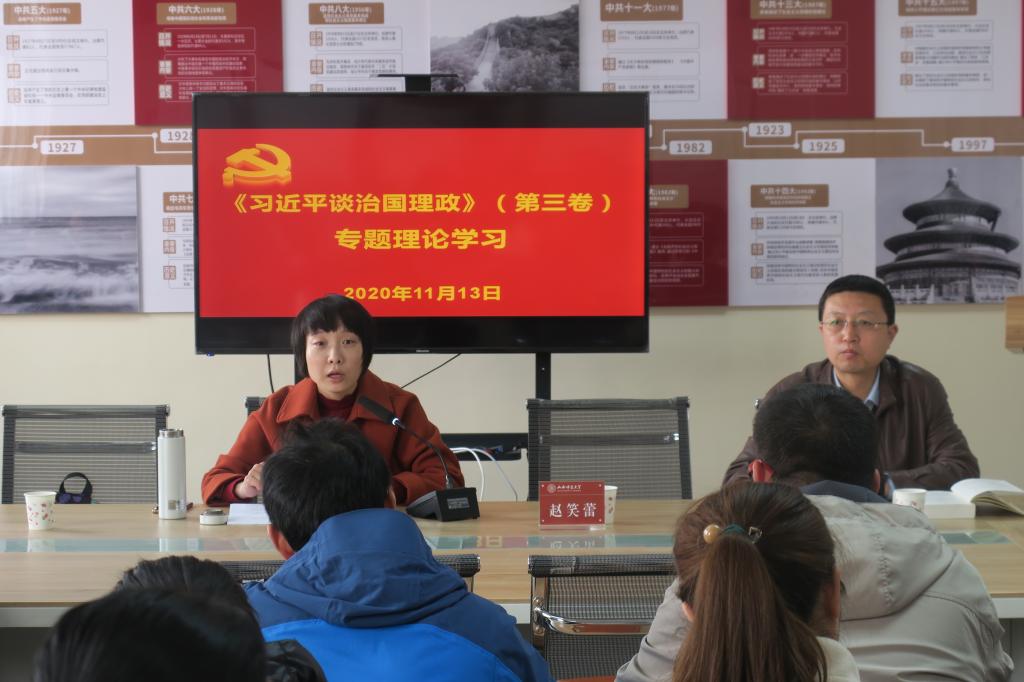 11月13日,我院党委邀请马克思主义学院赵笑蕾教授在04618会议室作《习近平谈治国理政》第三卷专题报告会。党支部书记、师生党员40余人参加,院党委书记范晓东主持会议。