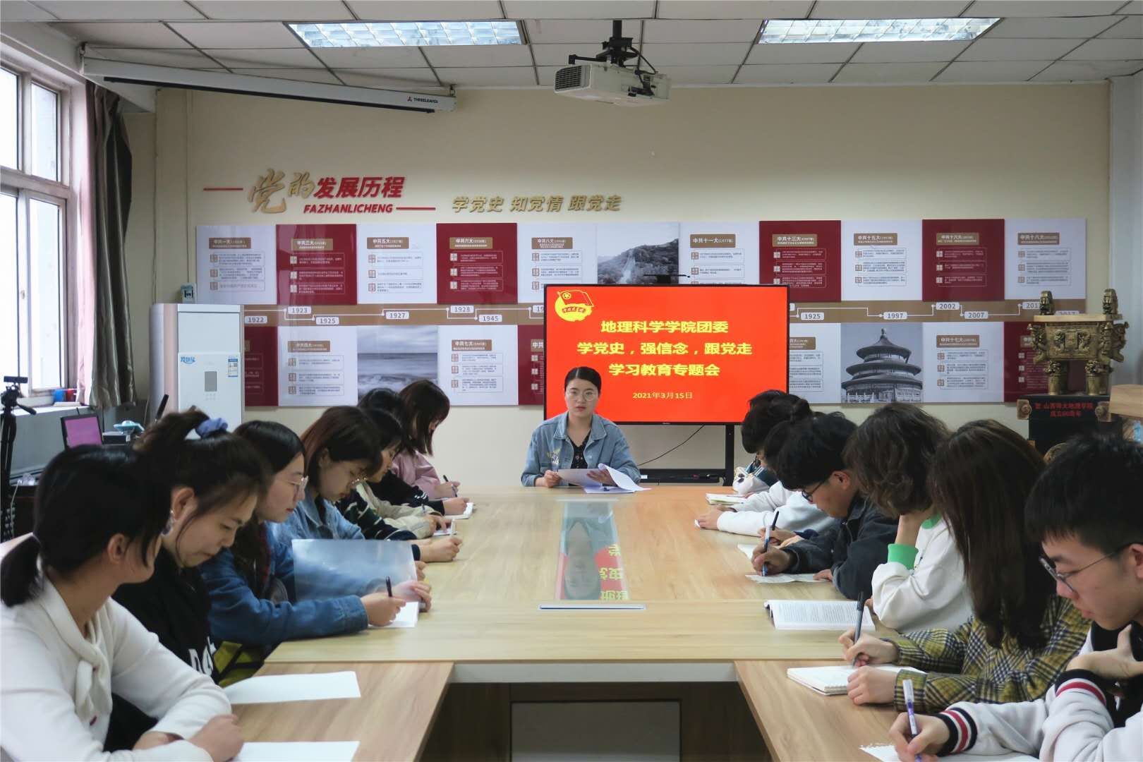 3月15日中午,地理学科学学院团委在04618会议室召开了“学党史、强信念、跟党走”学习教育专题会议。全体团学干部参加了会议,会议由团委副书记王亚婷主持。
