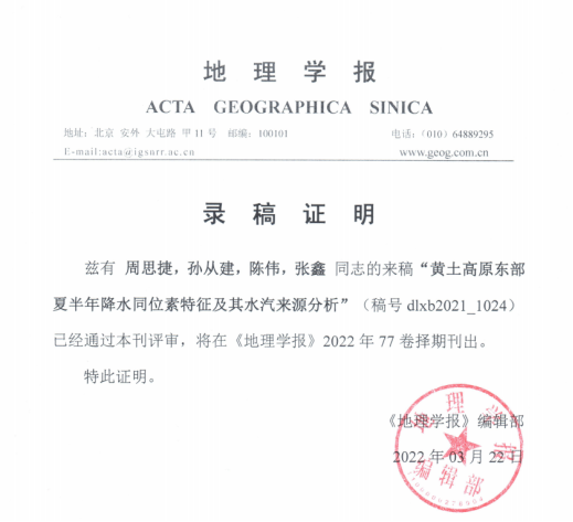 近日,该研究成果以“黄土高原东部夏半年降水稳定同位素特征及其水汽来源分析”为题发表于地理学术类顶级期刊《地理学报》。该论文第一作者为必赢766net手机版研究生周思捷,通讯作者为指导教师孙从建教授,这是我院近十年来首次在地理学报上发表文章,也是我院建校以来首次以研究生为第一作者在此期刊上发表学术论文。