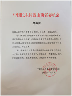近日,我院副教授、民盟盟员陈伟、我院教授、共产党员孙从建及马克思主义学院副教授、民盟盟员崔宏义联合撰写的《关于进一步加强黄河中游吕梁山欠发达地区环境遥感监测的建议》提案被民盟山西省委员会采用,并作为民盟山西省委员会的集体提案提交至山西省政协十二届五次会议,并已立案。中国民盟山西省委员会专门发来感谢信,信中说“感谢山西师范大学教师对于参政议政工作的大力支持,希望在今后的工作中,再接再厉,积极建言献策。”