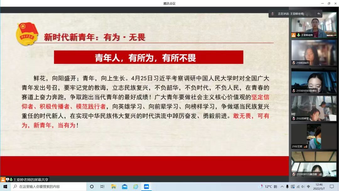 5月7日,我院团委书记王亚婷讲授“同奋斗,共青春”主题团课,学生干部、21级全体学生参加了学习。