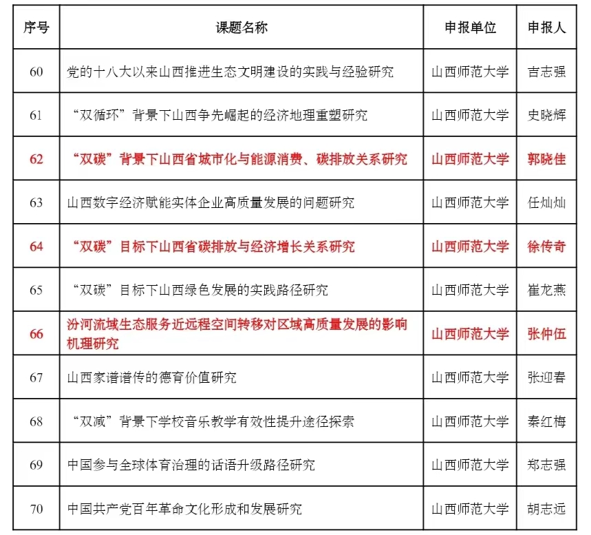 我院张仲伍院长的《汾河流域生态服务近远程空间转移对区域高质量发展的影响机理研究》、郭晓佳老师的《“双碳”背景下山西省城市化与能源消费、碳排放关系研究》以及徐传奇老师的《“双碳”目标下山西省碳排放与经济增长关系研究》进入拟立项名单。对以上老师表示热烈祝贺。值得一提的是我校共有11名老师申报的专项课题进入拟立项名单,其中我院占有3名。