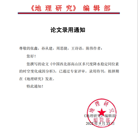 近日,该研究成果以“中国西北部高山区多尺度降水稳定同位素的时空变化成因分析”为题录用待刊于地理学顶级期刊《地理研究》。该论文第一作者为必赢766net手机版研究生张鑫,通讯作者为指导教师孙从建教授,这是我院自建校以来首次以研究生为第一作者在此期刊上发表学术论文。此研究得到国家自然科学基金项目(41901022)的资助。
