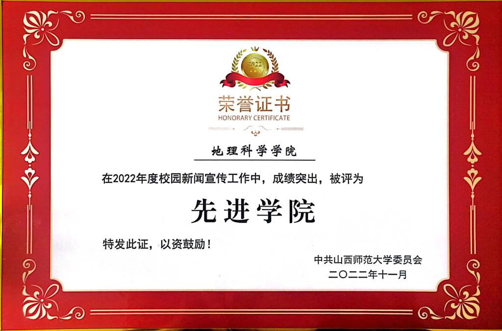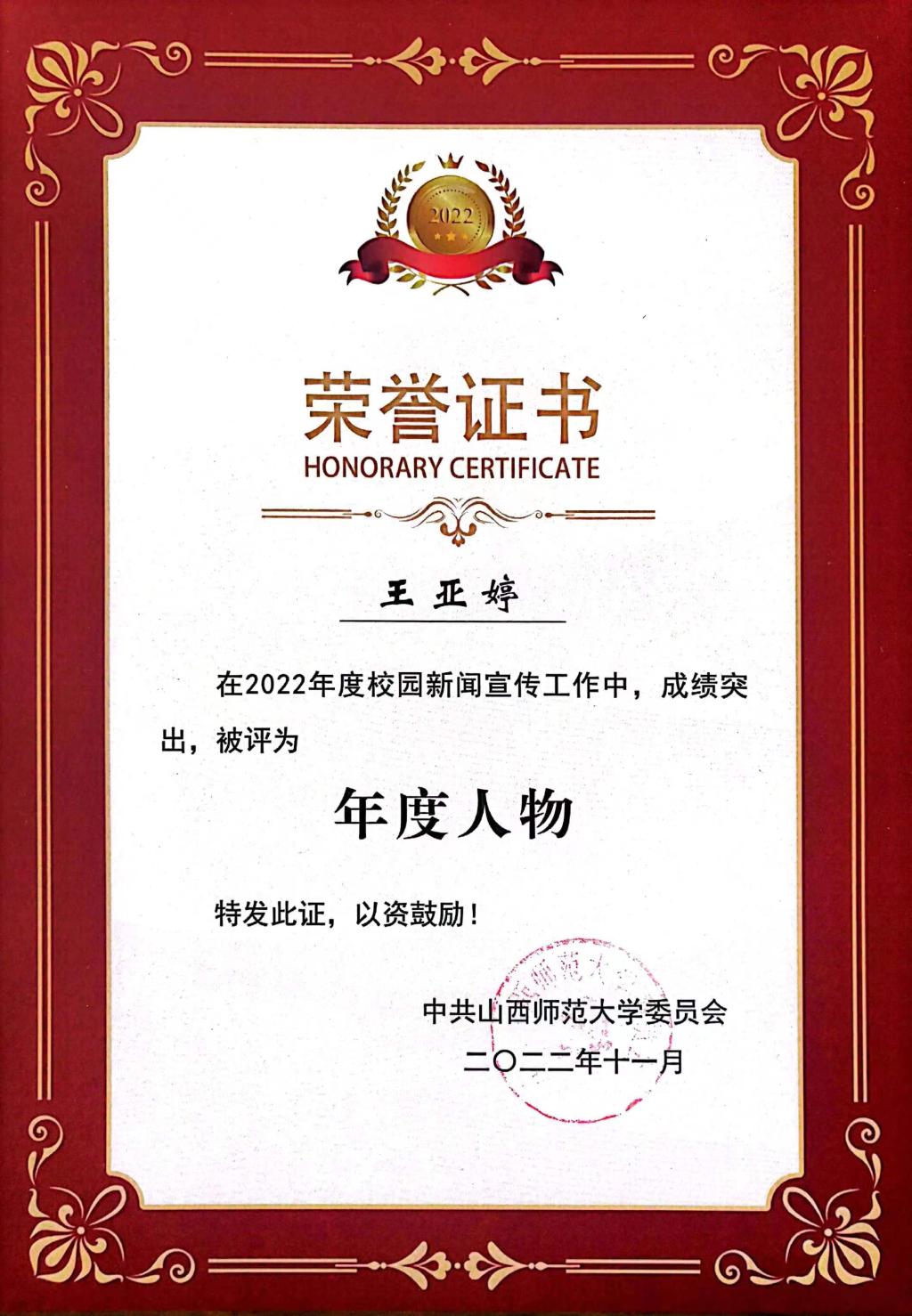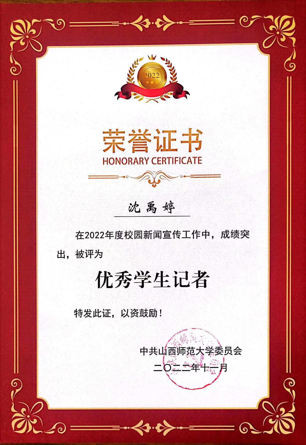 在我校下发的《关于表彰 2022 年度新闻宣传工作各类先进的决定》中,我院荣获新闻宣传“先进学院”,团委书记、宣传员王亚婷荣获新闻宣传“年度人物”,2005班沈禹婷荣获“优秀学生记者”称号。