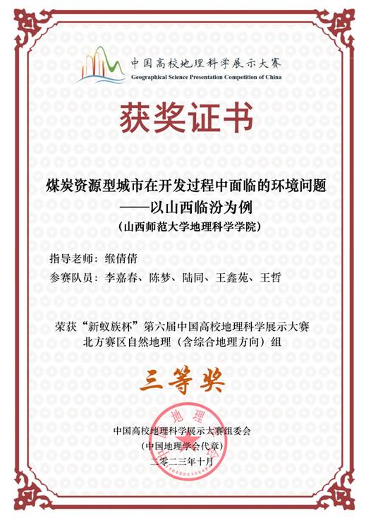 10月13日至15日,“新蚁族杯”第六届中国高校地理科学展示大赛北方赛区总决赛在河北师范大学举办。我院2021级本科生李嘉春、陈梦、陆同、王哲、王鑫苑组成的乌煤“子将”队在竞赛中荣获团体三等奖,指导老师为缑倩倩。