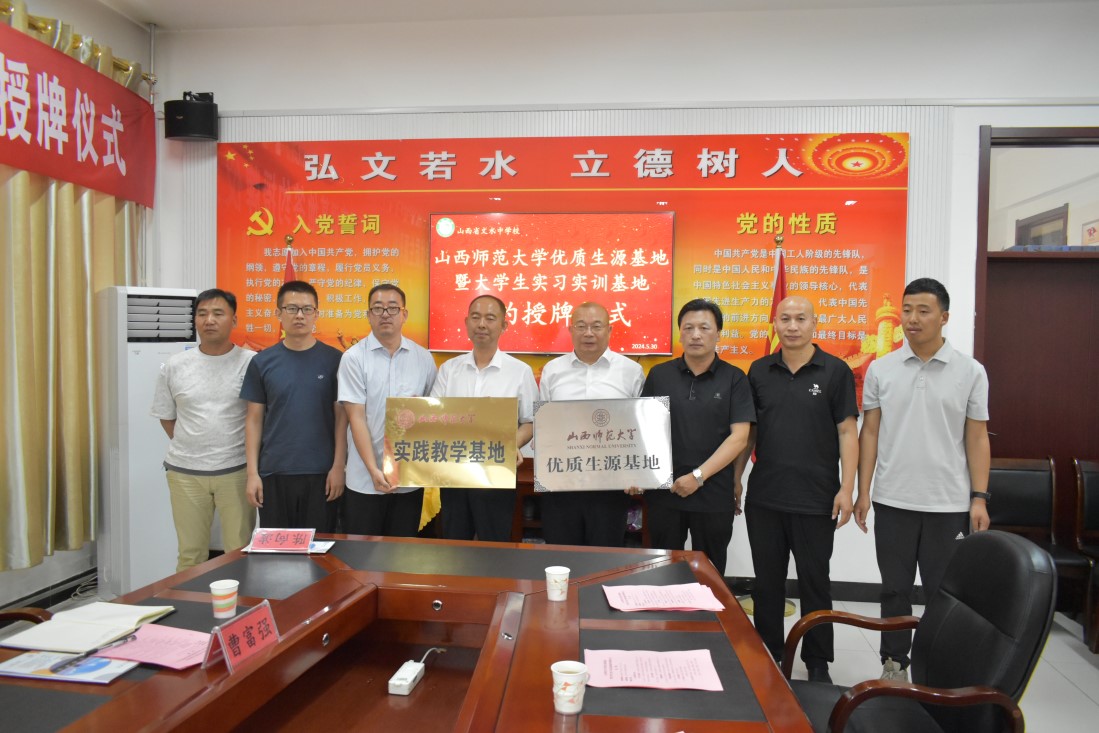 为提高人才培养质量,加强高校与中学的深度融合,推进院地合作,拓宽毕业生就业渠道,2024年5月30日,必赢766net手机版院长张仲伍教授、副院长王国华教授、副院长解毅教授、实验室主任曹富强副教授、王钊副教授一行五人前往文水中学进行“山西师范大学优质生源基地”“实践教学基地”授牌签约仪式暨访企拓岗活动。仪式由文水中学副校长赵瑞刚主持,文水县委组织部副部长马智勇、文水县委组织部人才室常玉浩、文水中学工会主席武希平、教导主任李春阳及文水中学部分教师出席授牌签约仪式。