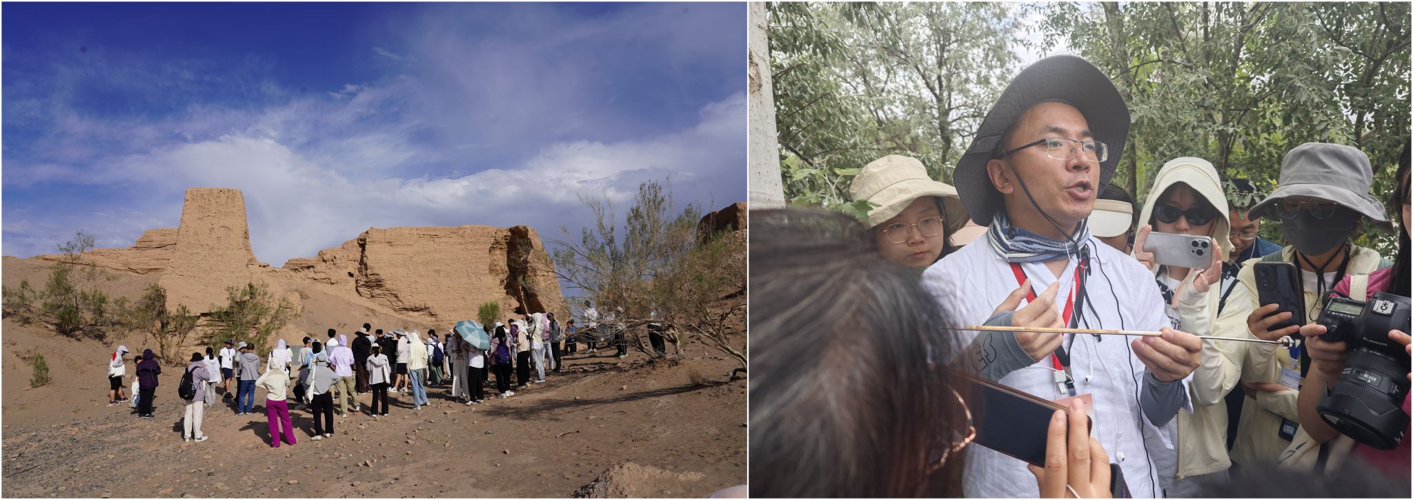 7月30日,我们首先来到了张掖黑水国古城遗址,李卓仑老师给我们讲解了黑水国古城的建造结构,发展演化以及消亡的可能原因。随后师生们带着满心的疑惑与好奇,小心翼翼地搜寻着古城遗留下的每一片瓦砾、每一块碎石。这些看似不起眼的遗迹,在大家眼中却如同解开过往神秘面纱的钥匙。接下来,我们来带了张掖国家湿地公园,南京师范大学商志远老师给大家讲解了年轮测量相关知识,并现场进行了树芯采样。丁素婷老师给大家讲解了河西走廊水资源利用相关知识。