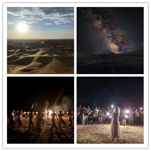 经过短暂的休憩与准备,下午两点,我们踏上了前往内蒙古阿拉善右旗九棵树沙漠景区的征途。长途跋涉后,终得一见那辽阔与壮美的沙漠景观,无垠的沙海在夕阳下泛着金色的光芒。夜幕降临,沙漠的星空格外璀璨,在西南大学爱好宇宙星座同学的带领下,大家对宇宙星座进行了辨识。随着夜色渐深,一场温馨而热烈的篝火晚会在沙漠中悄然上演,夜晚11点多大家才恋恋不舍离开九棵树。