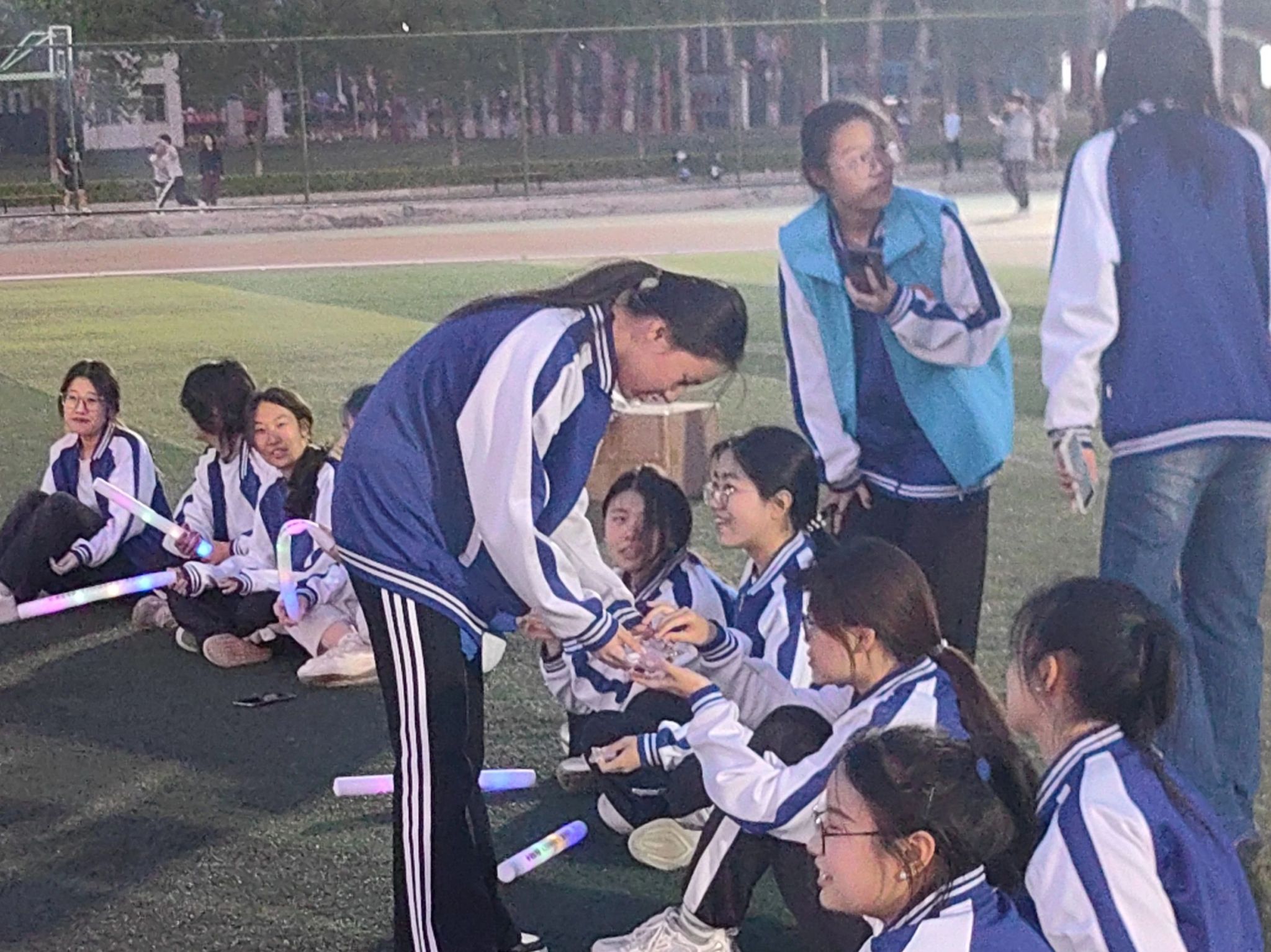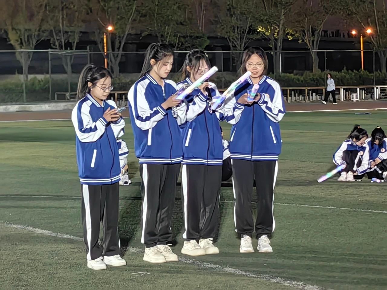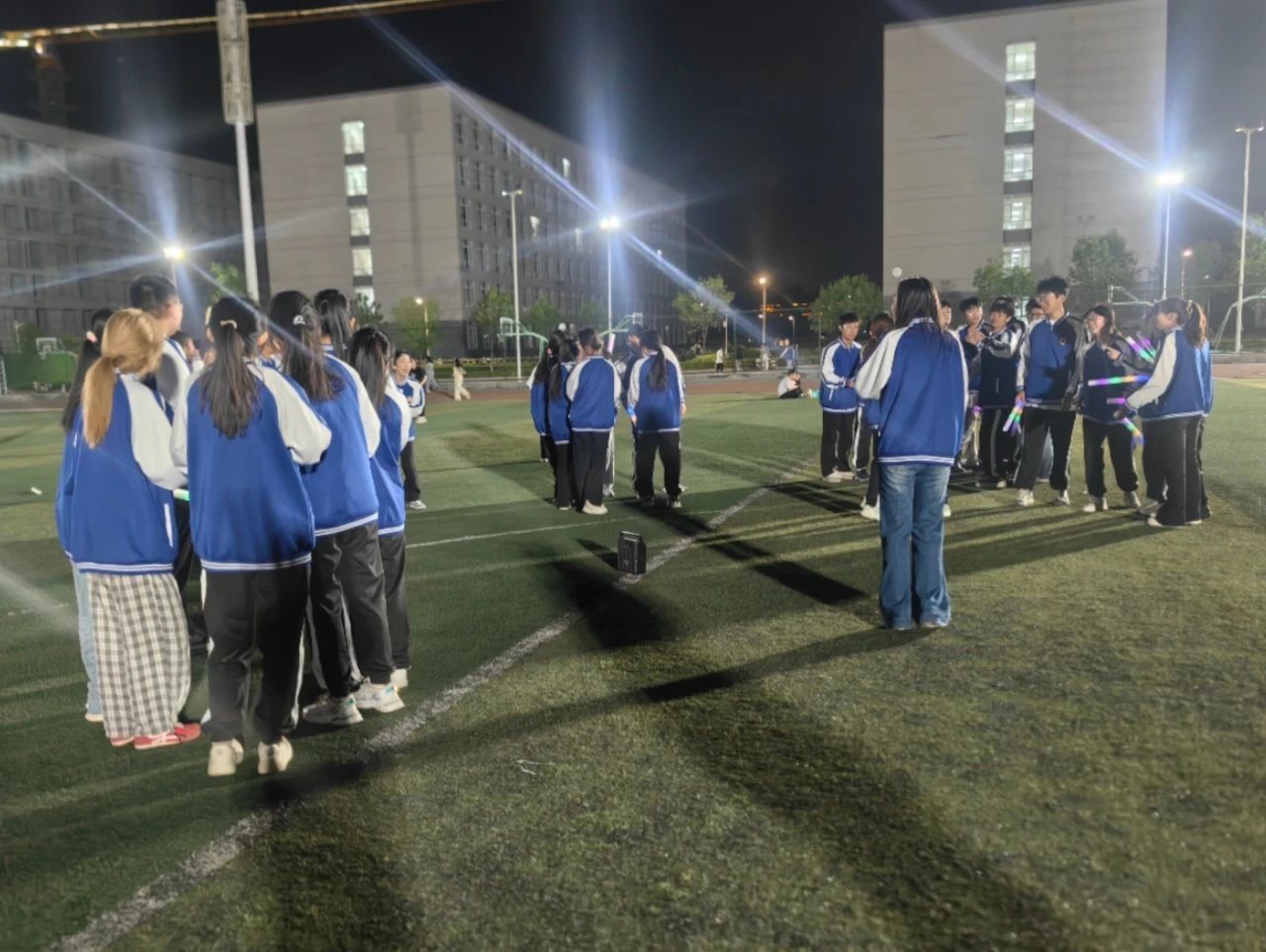 夜跑结束后,各青马小组在北区操场进行了才艺展示以及“红色歌曲猜猜猜”“数七”“五角一元”等有趣的项目。手持荧光棒的学员们用青春的活力点亮了这个夜晚,也点亮了对健康生活的热爱。