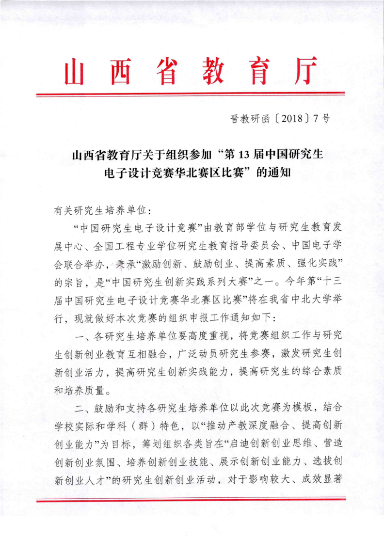 【通知】关于组织参加“第13届中国研究生电子设计竞赛华北赛区比赛”的通知